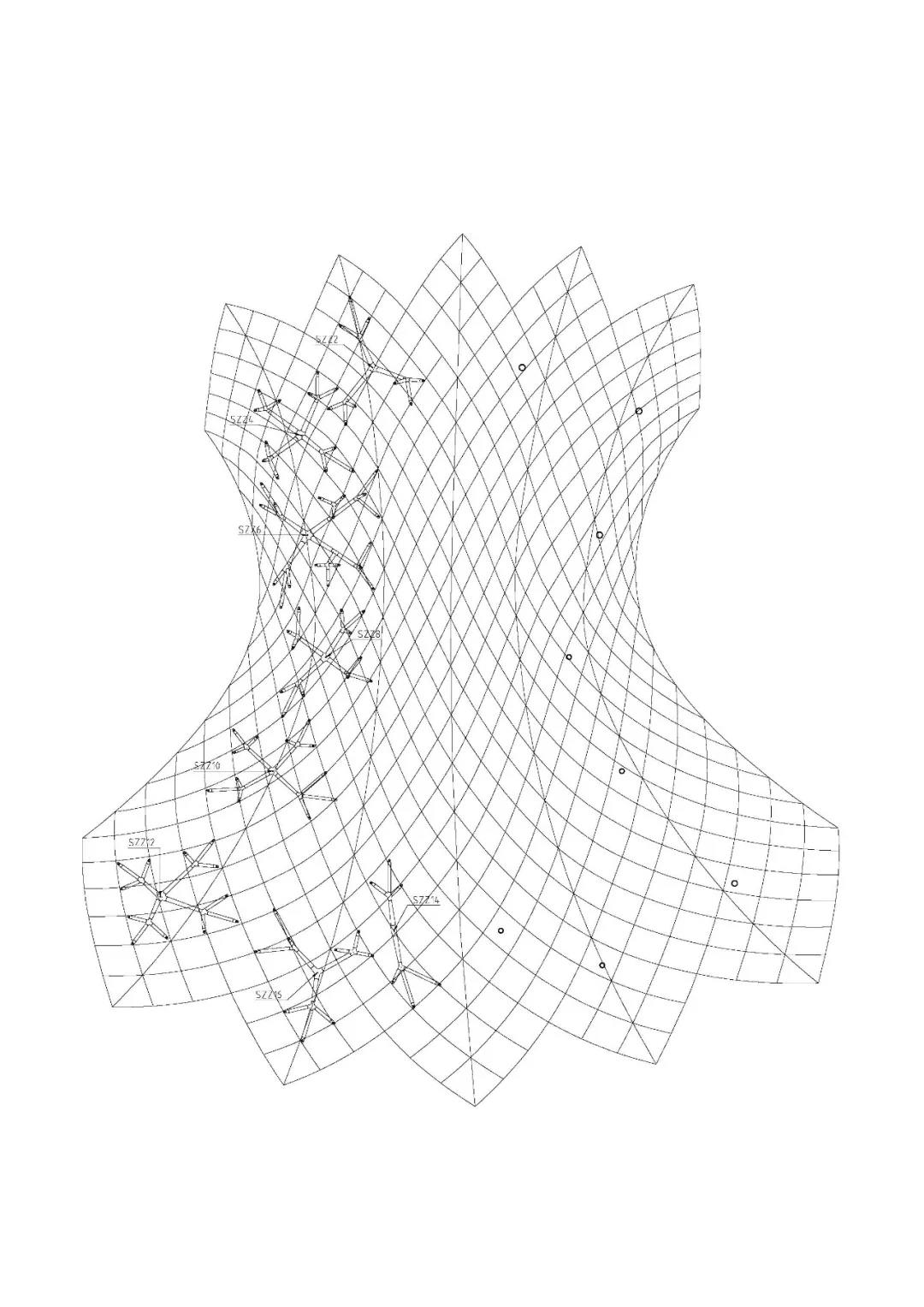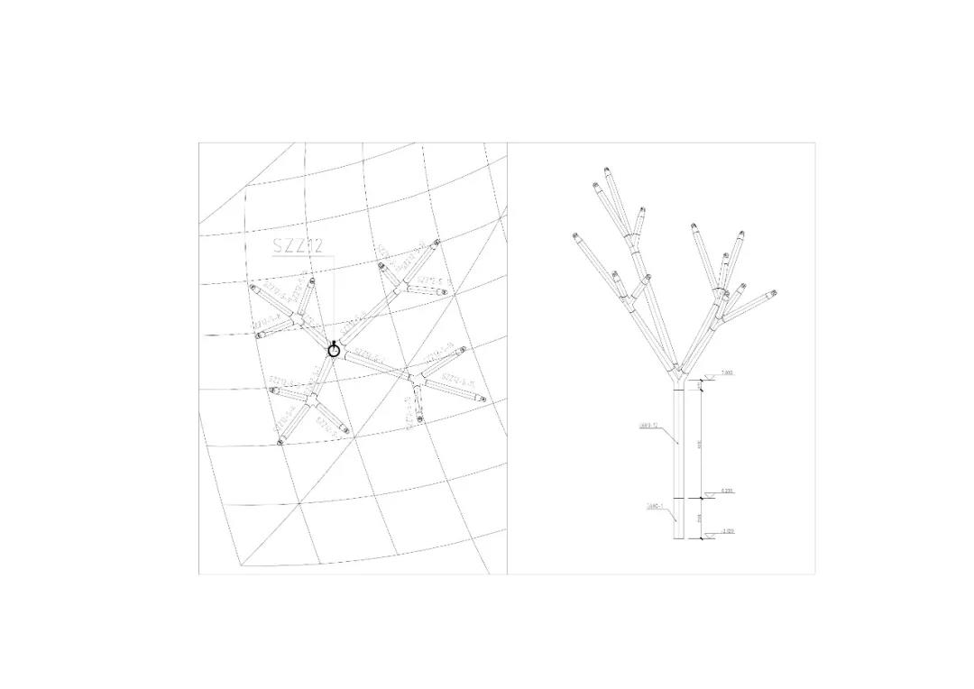 樹枝以長度與角度為參數,三級迭代生成樹枝,查找就近點確定樹枝與屋面網架的連接位置。樹枝結構位置最大限度的減少支撐體系對觀演視線的影響。
