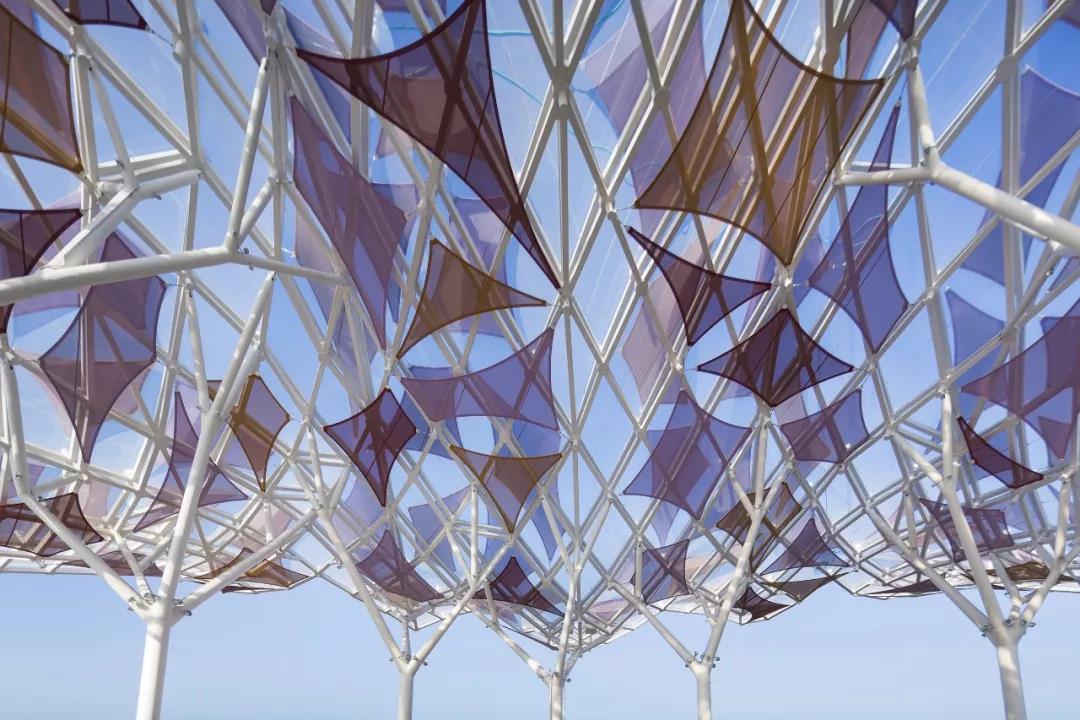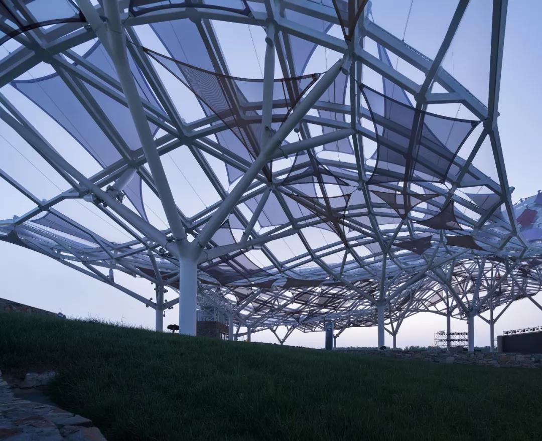 屋面三層張拉膜,中間透明膜遮雨,上下兩層彩色膜遮陽。彩色膜的三種色彩呼應花田粉,黃,紫三種顏色。彩色膜的選色是設計過程中遇到的又一技術難題。幾種正常光線照射下色彩鮮艷的膜,吊掛到屋頂逆光下從下往上看變成了灰色,進行了多次色彩實驗,發現網格膜在逆光下的發色反而比光面膜準確。最終選擇了網格膜,廠家訂制了三種接近花田三色花的特制顏色,與衲田花海呼應。