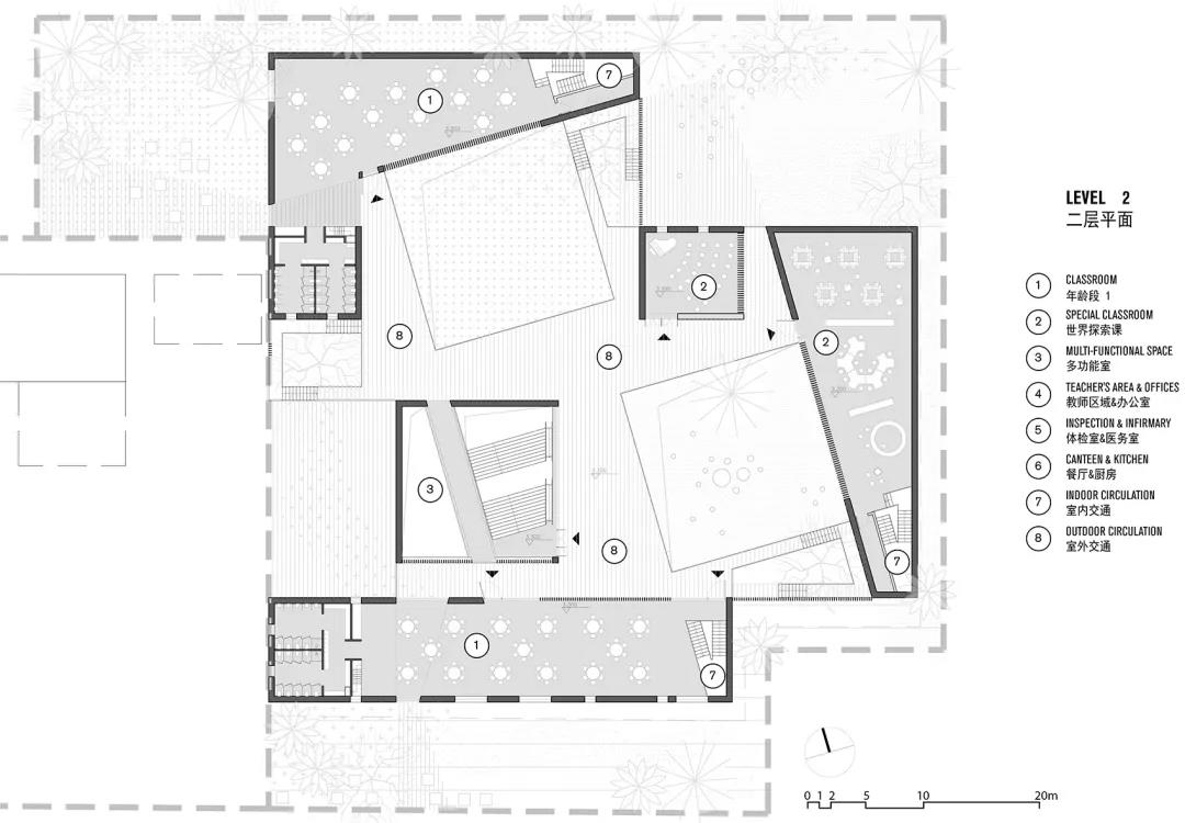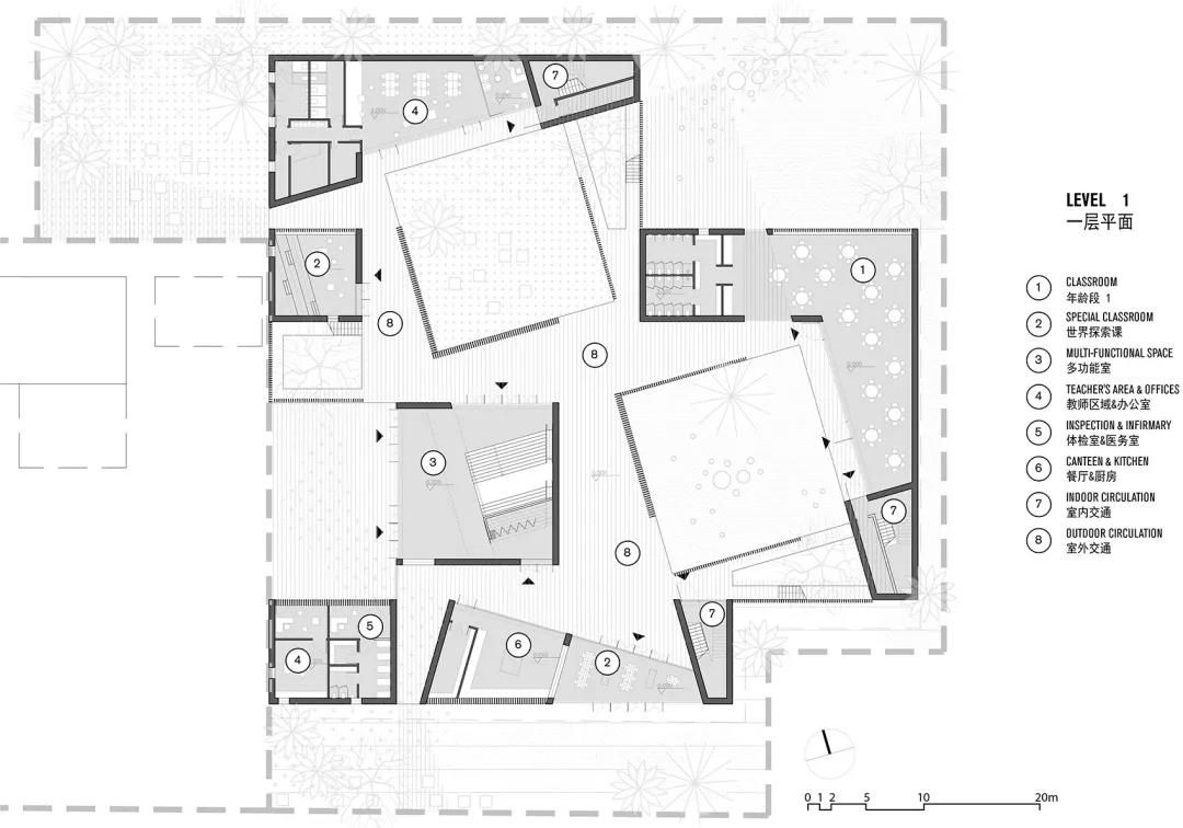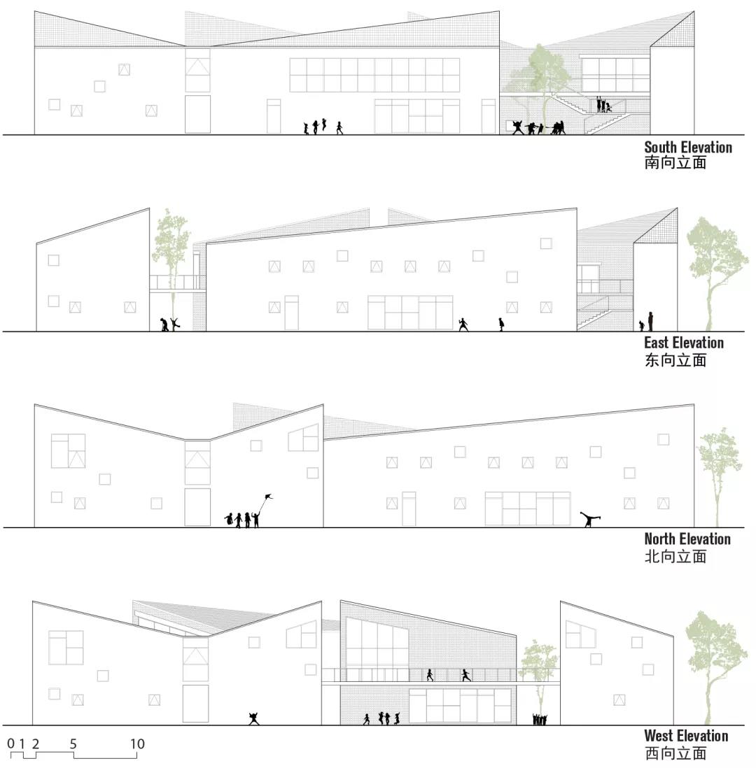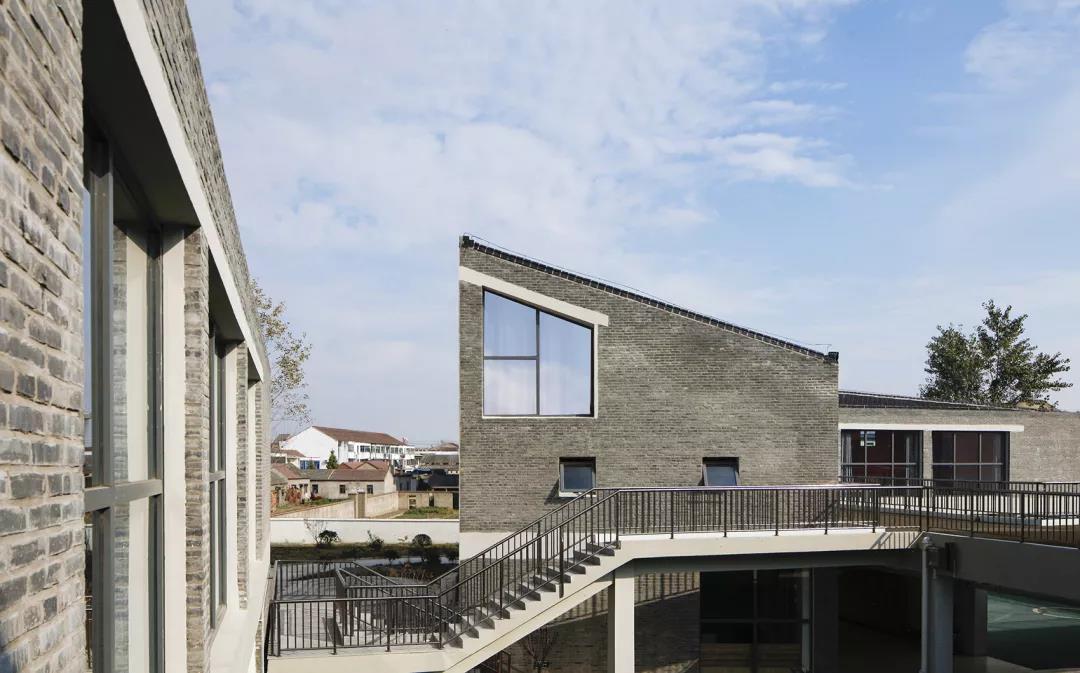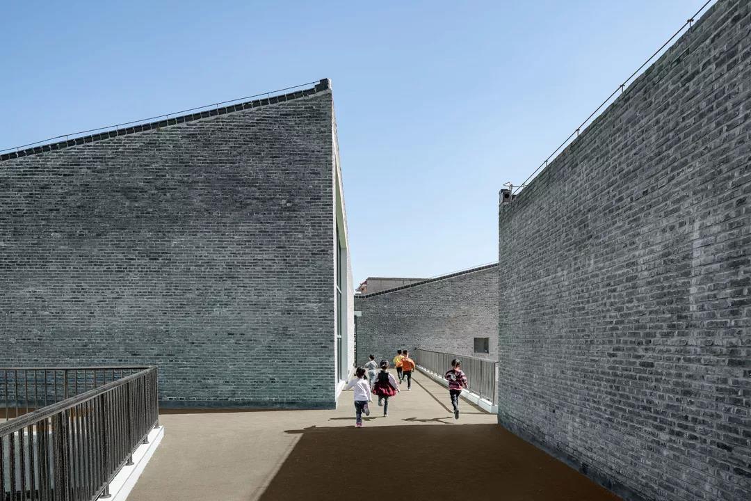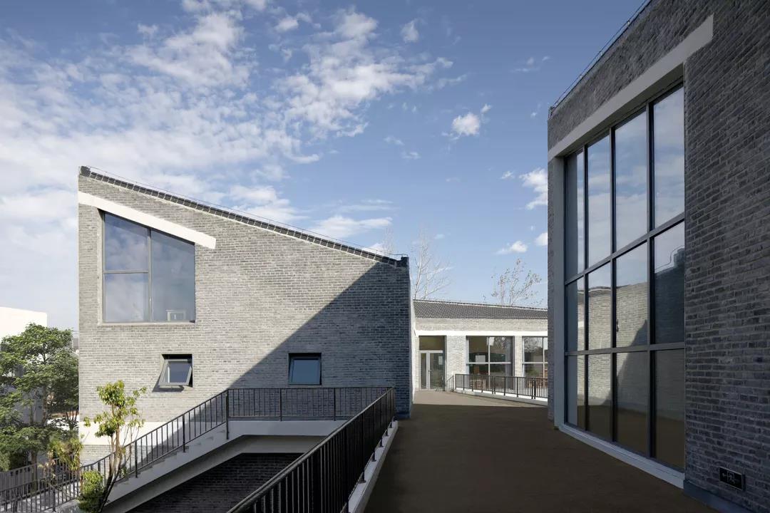 建筑風格尊重和延續(xù)了蘇中傳統(tǒng),和當?shù)孛窬雍魬⒁栏鳁澖ㄖ捏w量大小有所變型。建筑立面上,內(nèi)庭的墻面主要由青磚砌成,外墻則一律是白色灰泥,在紛亂的縣城環(huán)境里脫穎而出,為孩子的世界保持一份純凈。立面上大小、高低不等的開窗,在保證日照的同時也形成通透、有趣的室內(nèi)外關(guān)系。