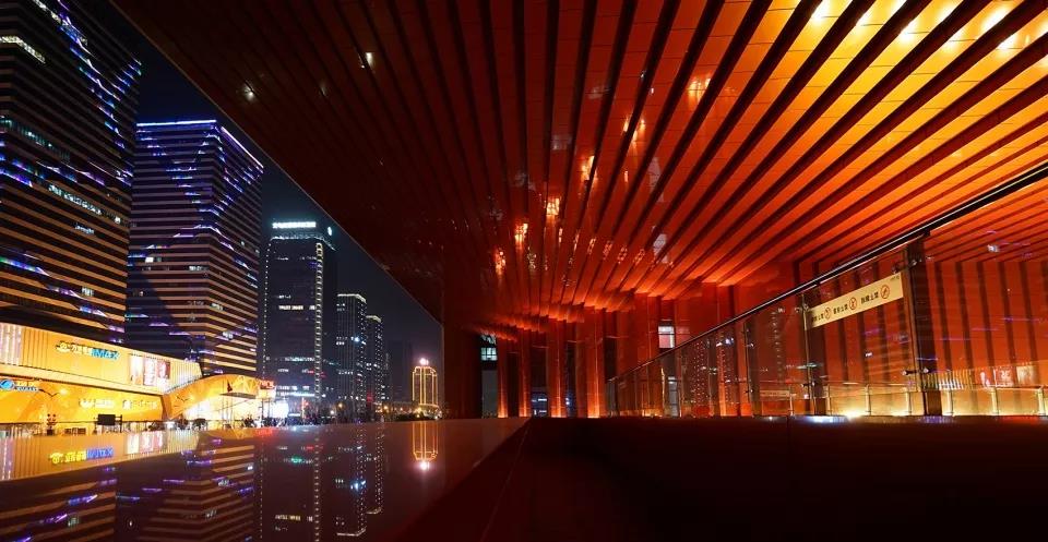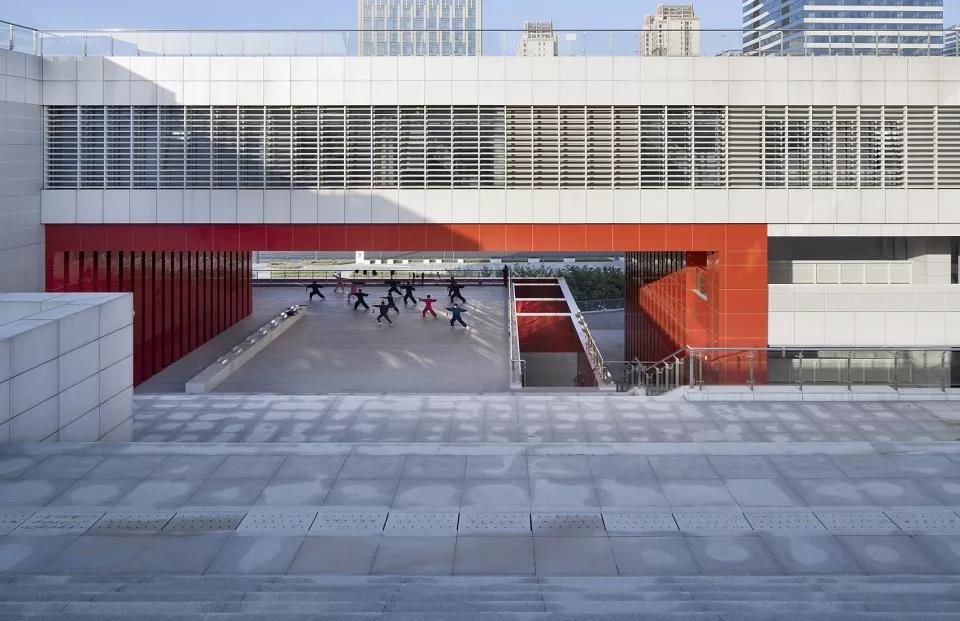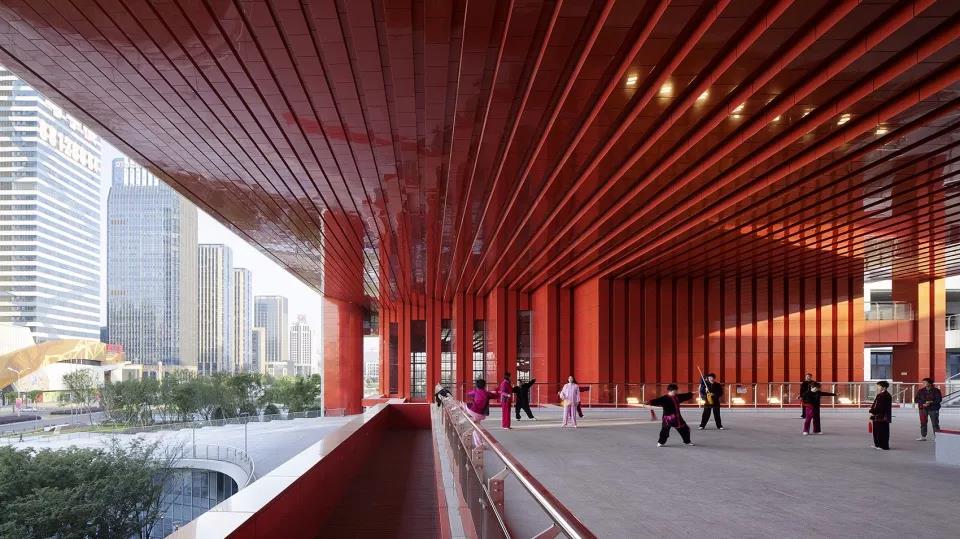大屋頂下的城市舞臺最為市民所喜愛,這里遮風避雨又視野良好,可同時欣賞到美麗的義烏江景與都市的繁華,每天清晨都有市民專程到此健身、運動、休憩。大屋頂檐下抽象的紅色疊澀造型,既像舞臺的帷幕又像宮殿的斗拱,體現出濃郁的東方文化氣息。