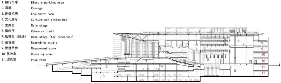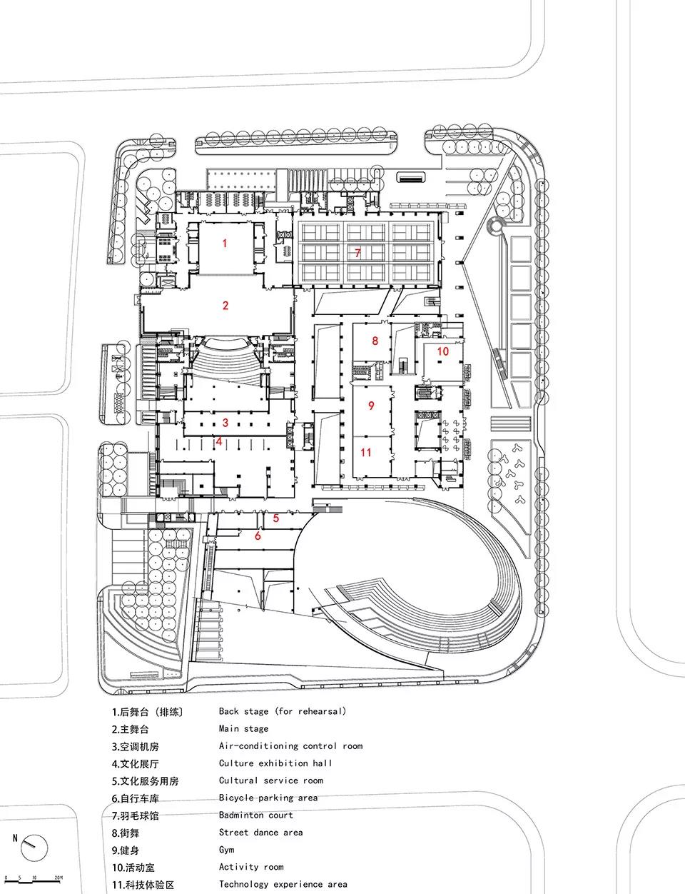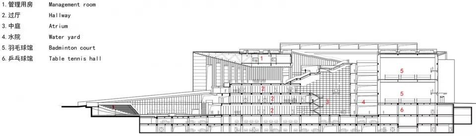 劇院、健身中心、青少年宮三大功能區塊圍繞立體庭院呈合院展開,合院的第四面則是巨大的主入口空間。主入口巨大屋頂如云垂天際,入口下巨大的灰空間正是源于戲臺、祠堂等江南傳統的公共空間模式,十分適合江南地區的公共文化活動要求。