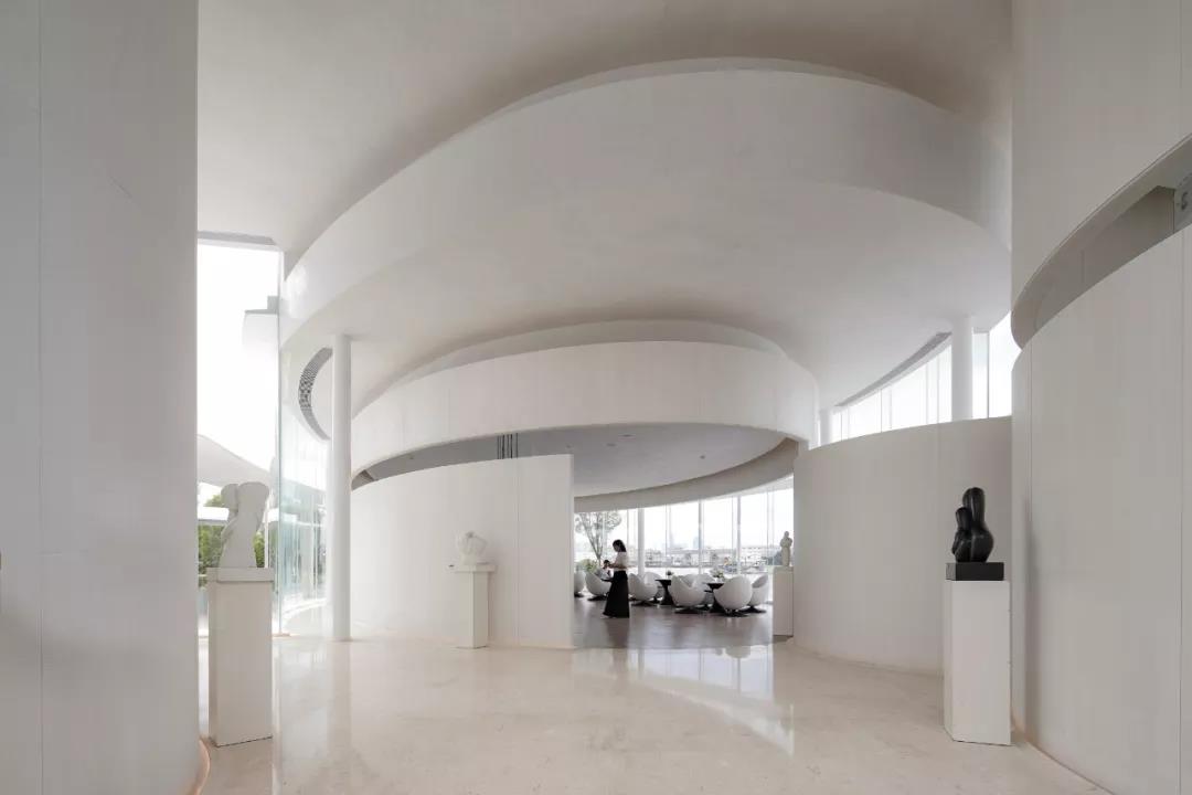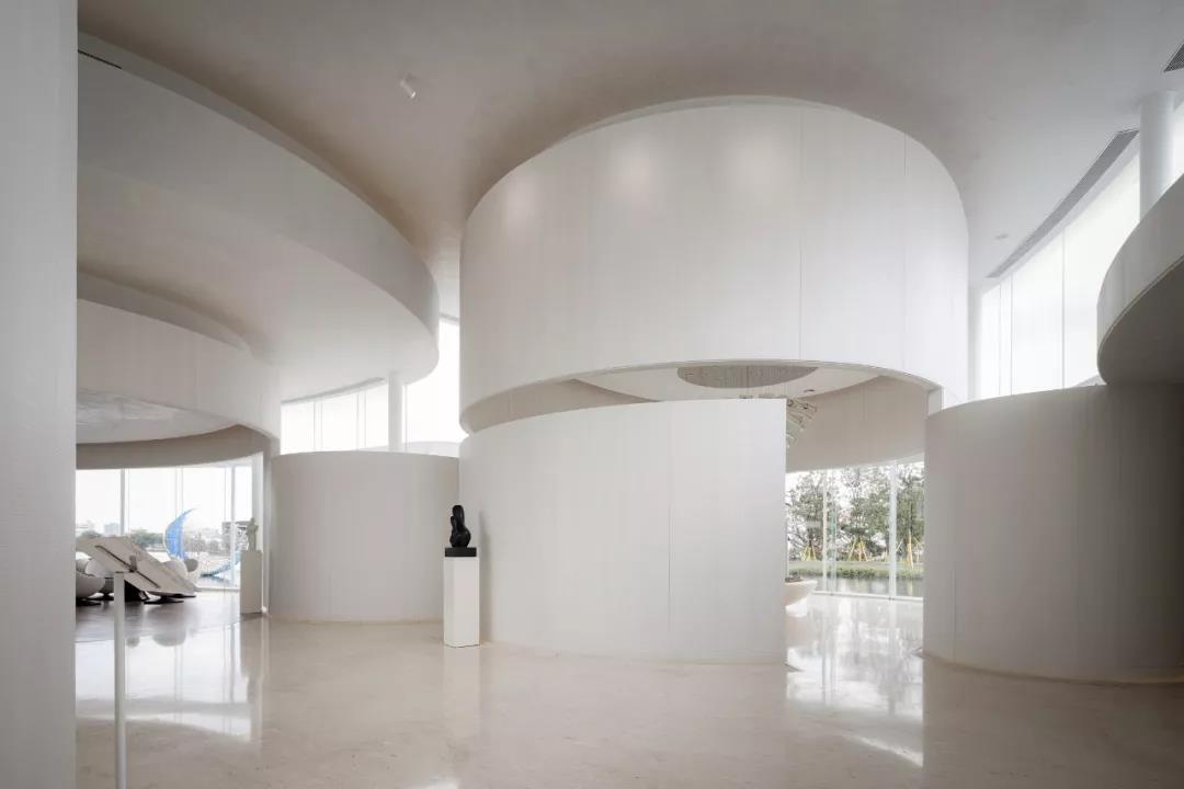 通往室內,我們采用白色的弧形片墻引導一個放射狀的空間序列,人的體驗由外部的自由靈動逐步被引領到建筑師設定的一連串層次豐富的空間,雕塑感的形態和對光線的引導賦予它美術館般的氛圍。