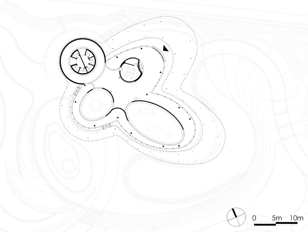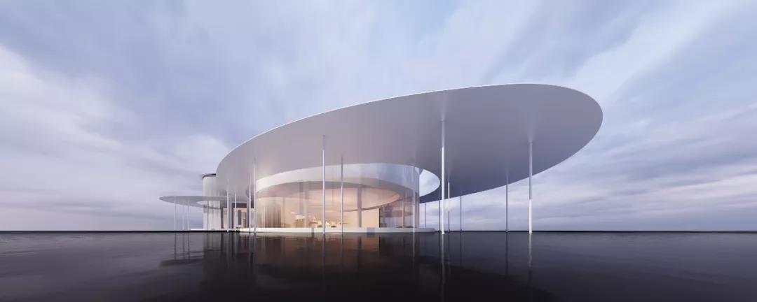 展廊主體由兩個橢圓和一個圓形相嵌合,外圈由25mm厚的鋼板飄蓬環繞,并由錯落分布的75mm直徑的鋼柱支撐。在外部,鏡面的水景,白色的反光材料,配合纖薄的實體,環境和陽光被柔和地反射進來,創造一種勻質、連續、透明的感覺。