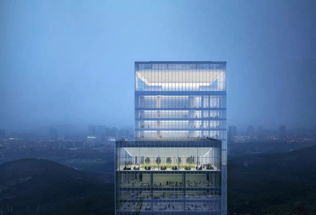 “幕墻不僅是建筑輪廓的勾勒,也是對內部空間進行雕塑和保護?!痹O計師韋業啟在塔冠巧妙地使用幕墻語言,以透明的玻璃幕墻配合燈光照明表達“光之谷”的概念,既與整體設計呼應統一,又與塔身辦公區域進行了功能區分示意,同時也將預留機房、擦窗機等基礎設施集中安置在主冠的“谷”中,不影響整體視覺效果,讓功能統一純粹。