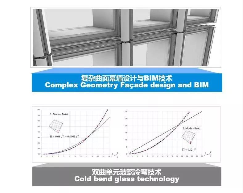 對于扭曲較大的雙曲面超高層而言,其擬合雙曲面一直是一大難題,設計師韋業啟與RFR通過深度合作,以復雜曲面幕墻BIM和雙曲幕墻單元的玻璃冷彎技術攻克了這一挑戰。獨創的幕墻系統能適應單元板塊多角度、多尺寸變化的要求,確保建成效果與模擬效果高度一致,并保證幕墻性能。而采用三維組框+平板玻璃冷彎設計的玻璃單元,以打破國內最大單元玻璃翹曲量的86mm讓設計得以實現。整個過程真正做到了從整體幾何優化分析、幕墻模型建模、LOD400加工圖深度構建建模,到加工圖數據自動生成和檢查的全過程幕墻BIM流程。