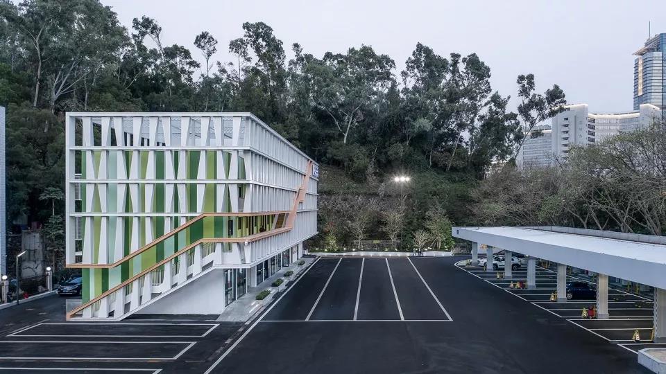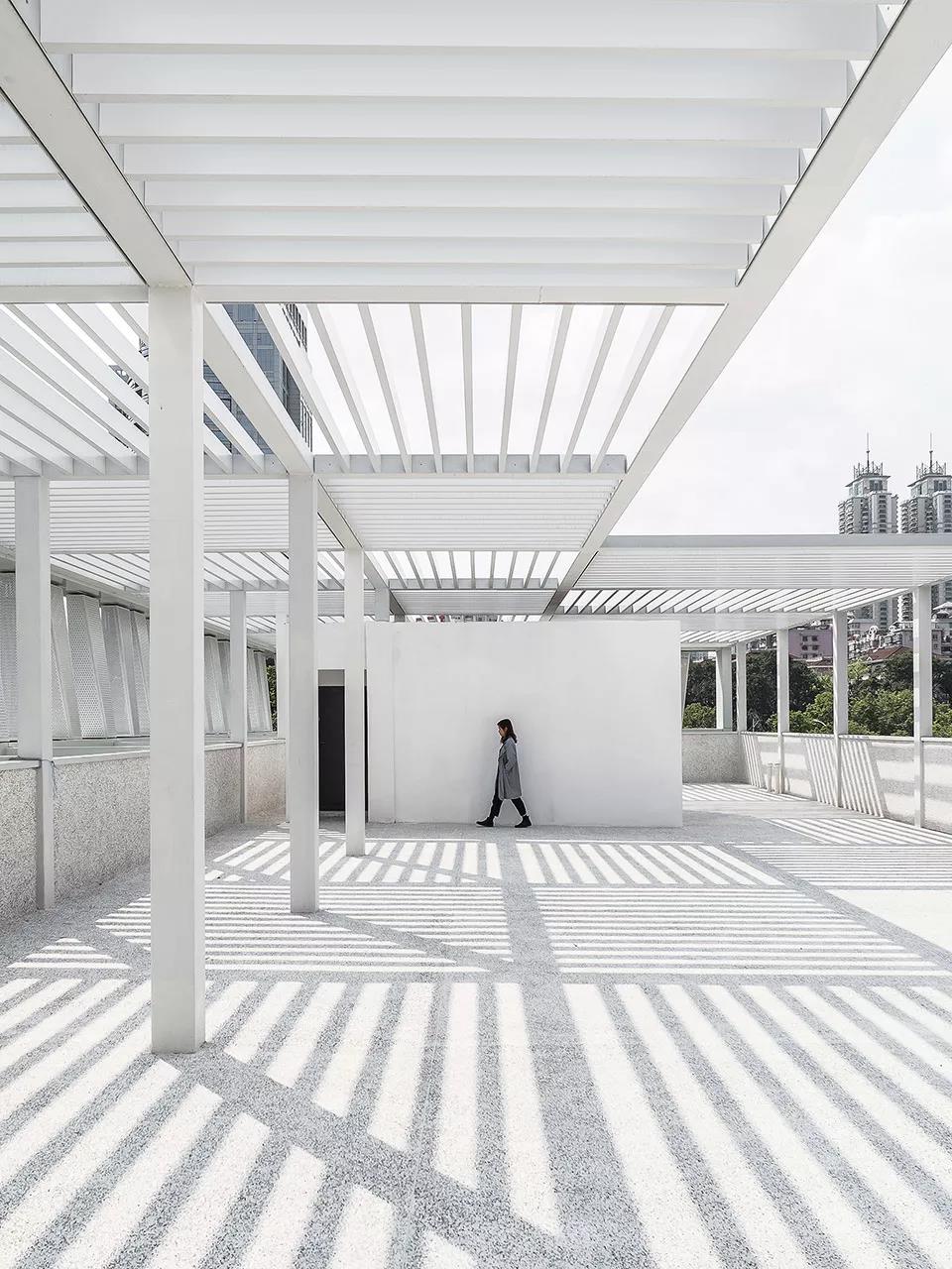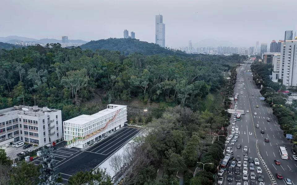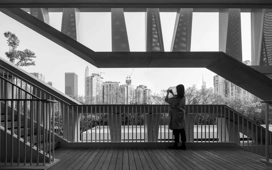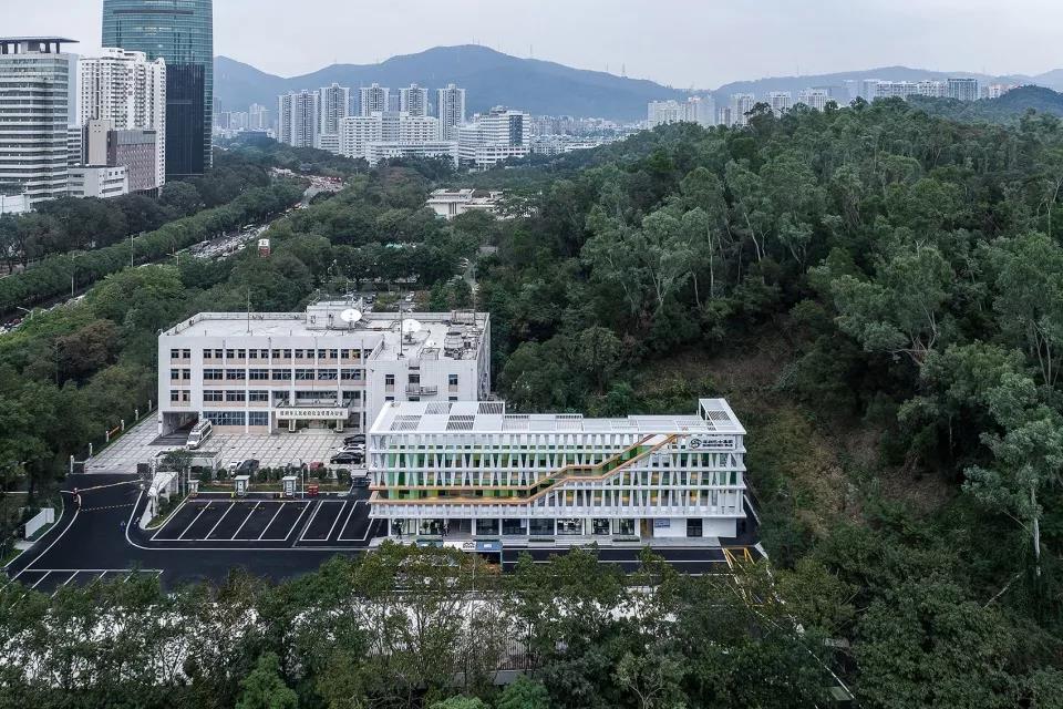 格柵覆蓋了大部分屋頂空間,除了具有遮陽作用,還與立面的幕墻形成一個完整結構系統,力學更優、更穩定。在靠山一側,留出的開敞空間成為與自然相接觸的花園。這個半開敞的屋頂空間容納了豐富的活動:種植農作物、開室外派對和觀看福田中心區城市夜景。