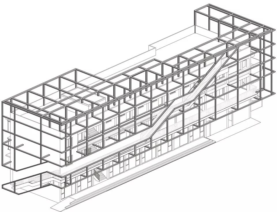 根據原有建筑梁的位置,新的幕墻分為四層,每一層靠原有結構出挑鋼梁支撐,并且每隔3.6米設置豎向鋼柱,使得加建的幕墻形成穩定的結構框架。