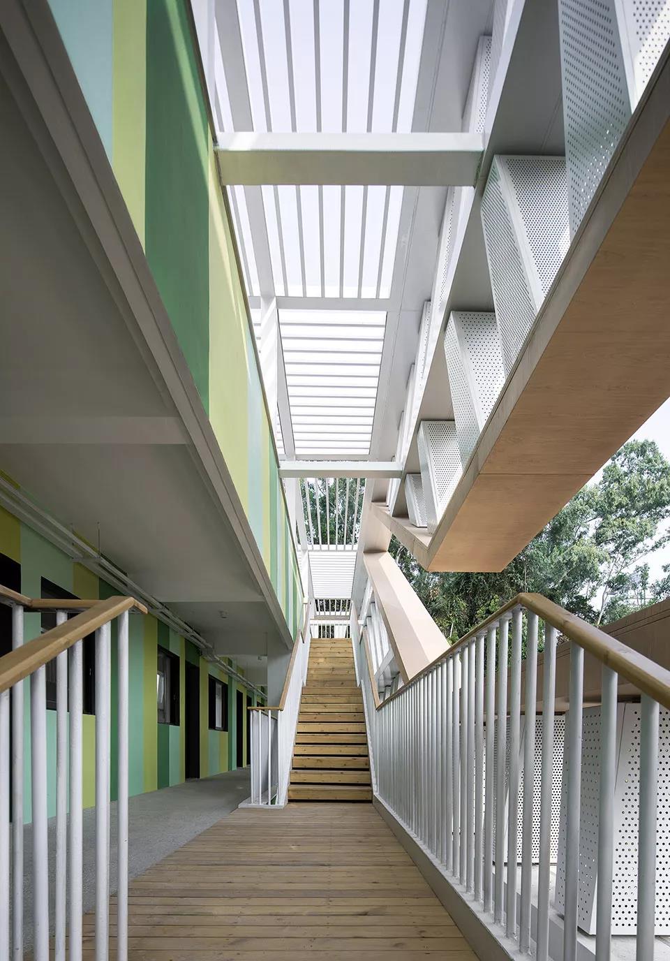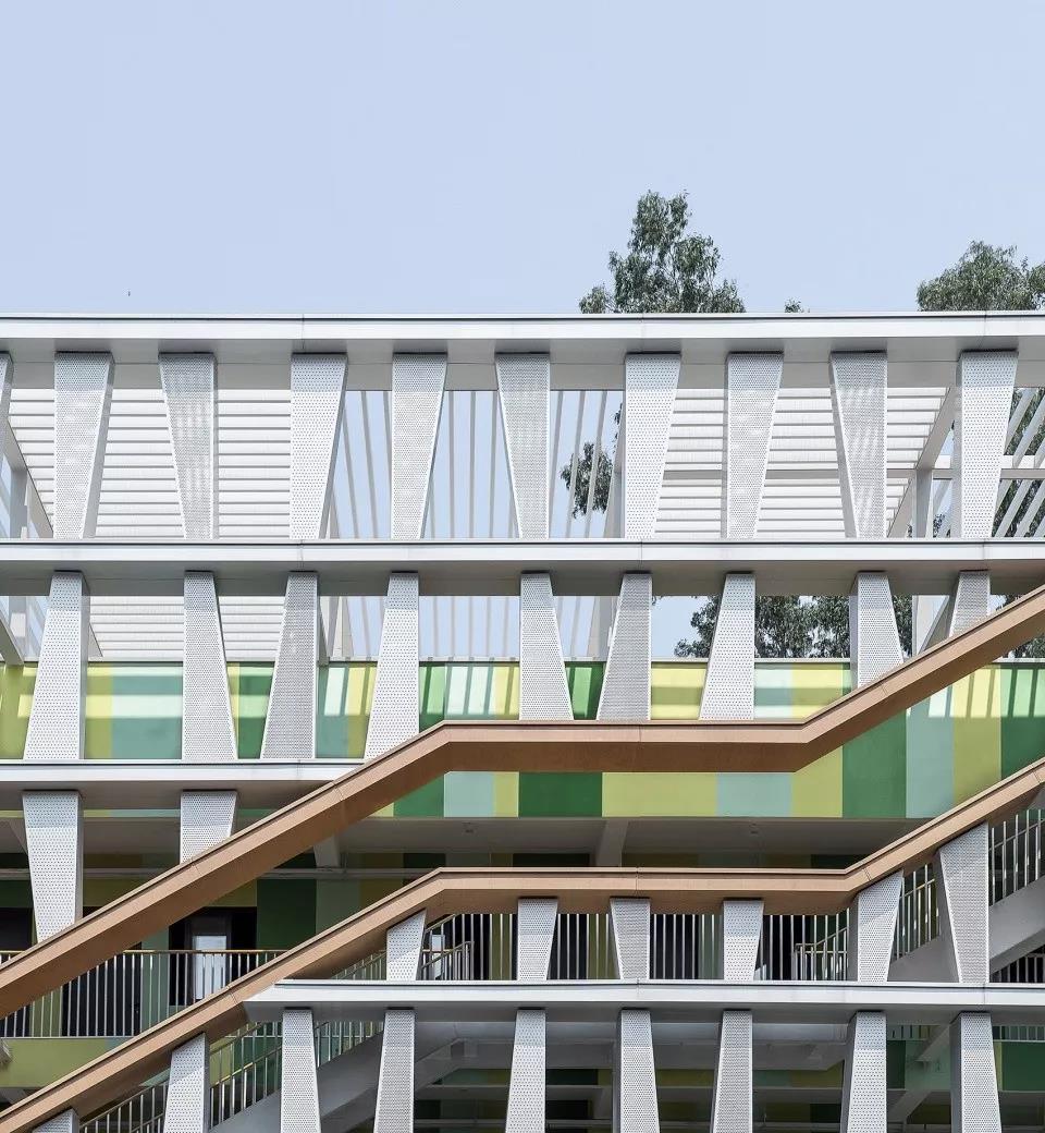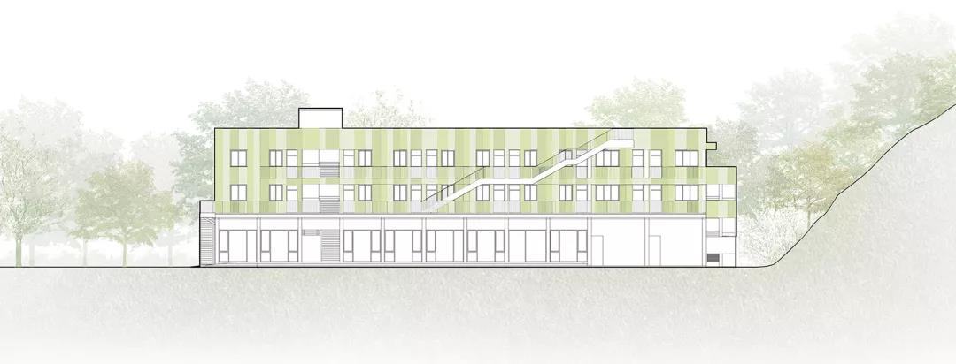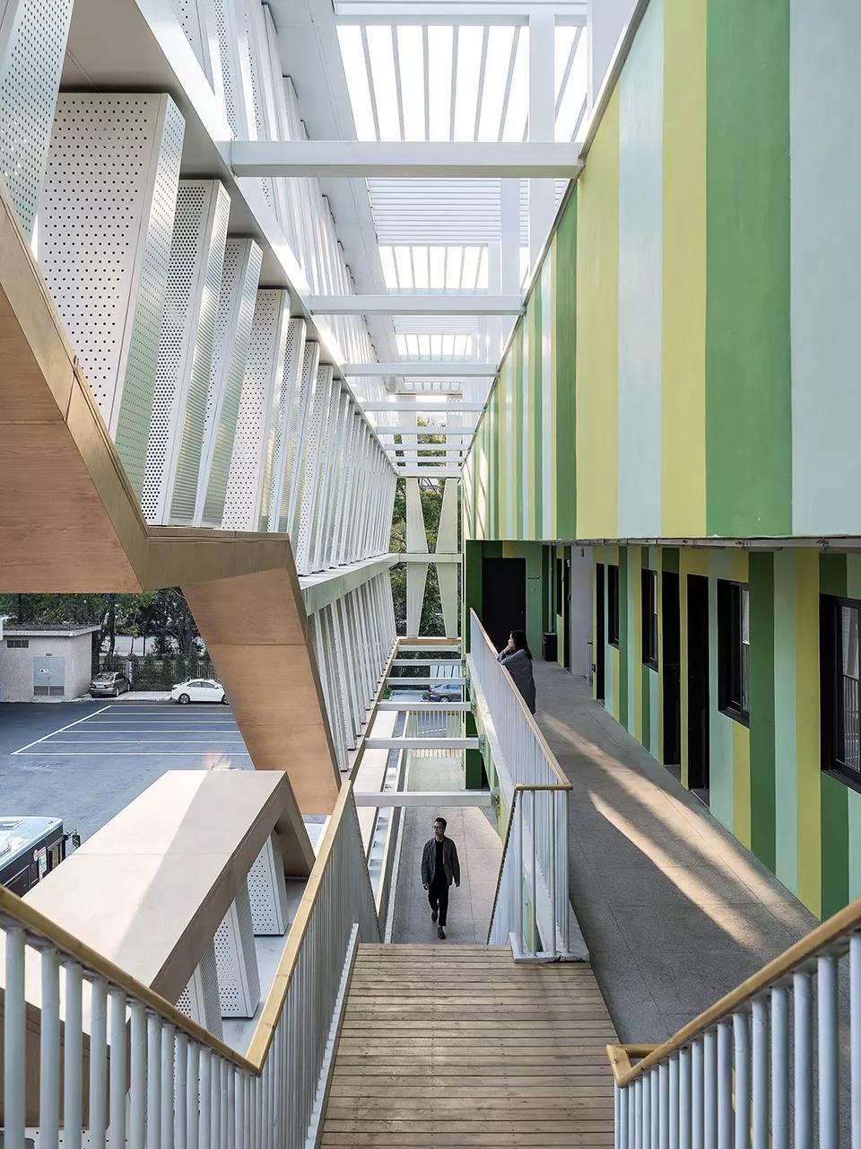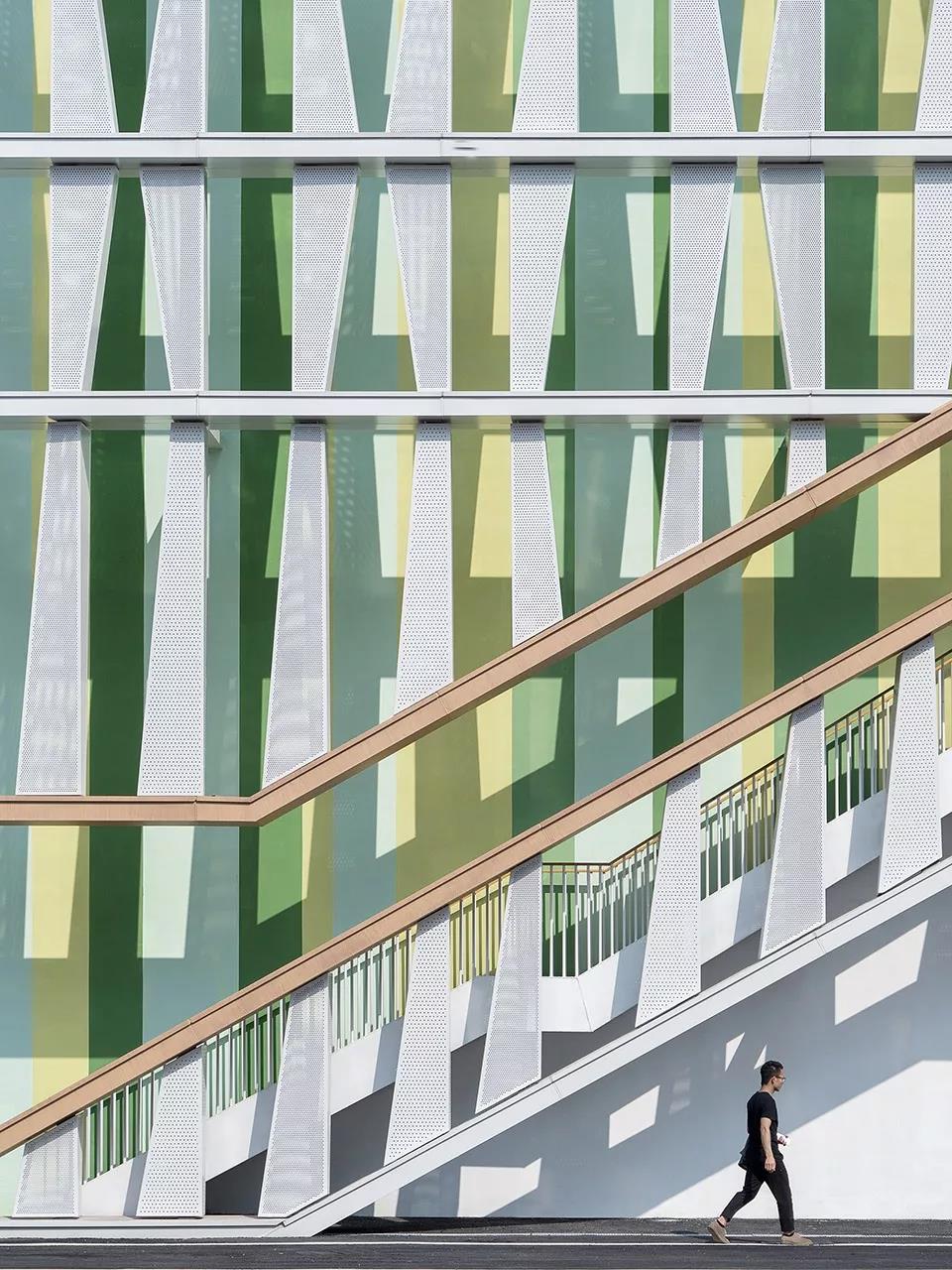 另一方面,原有的二層和三層的瓷磚墻翻新成涂料墻,四種綠色形成的豐富條形圖案與周邊的綠樹相得益彰。而白色的幕墻立面讓建筑保持謙遜的姿態的同時,內側的綠色外墻透過幕墻若隱若現。