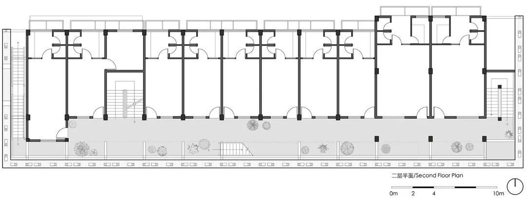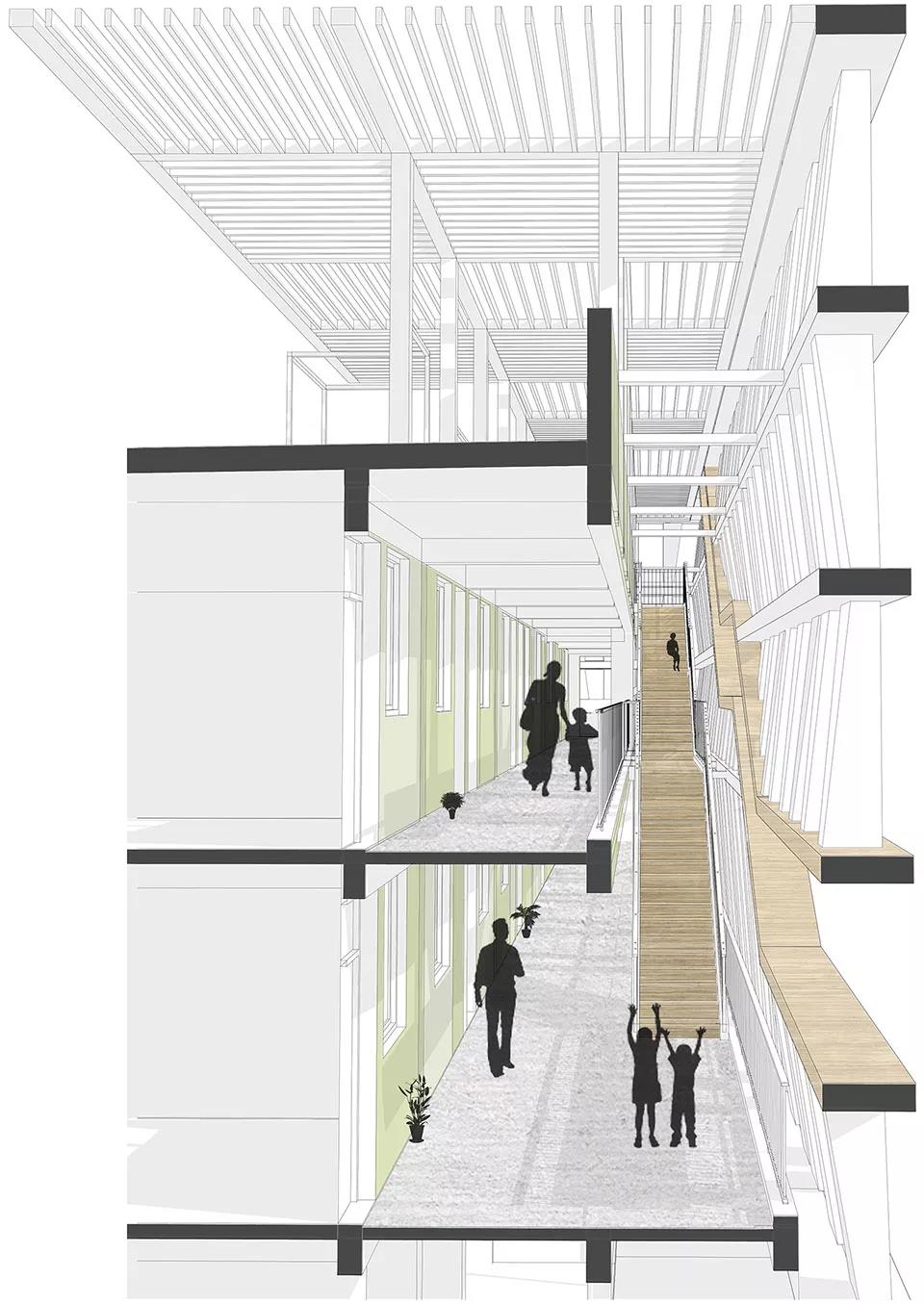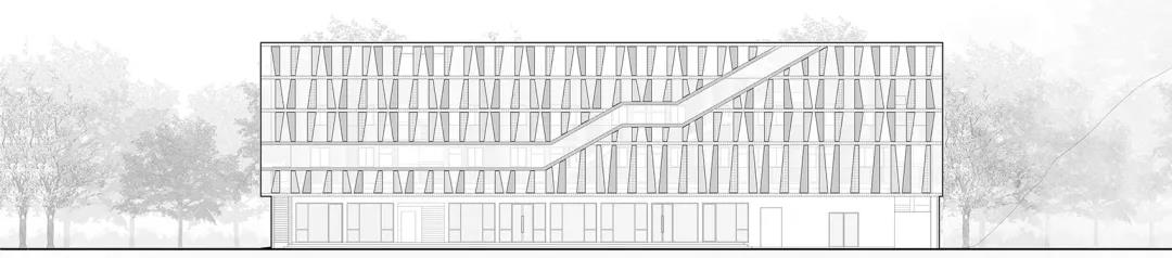 除此之外,設計在建筑里引入一條公共流線,通過樓梯串聯了一層北面食堂出口、二層、三層和屋頂空間,使不同標高的交流場所建立更緊密的聯系。新加的幕墻表皮也形成一條長條形開口對應著這條公共流線,使得內部空間與外立面形式統一。人在行走過程中也能透過開闊的開口觀看外部的綠樹與城市。