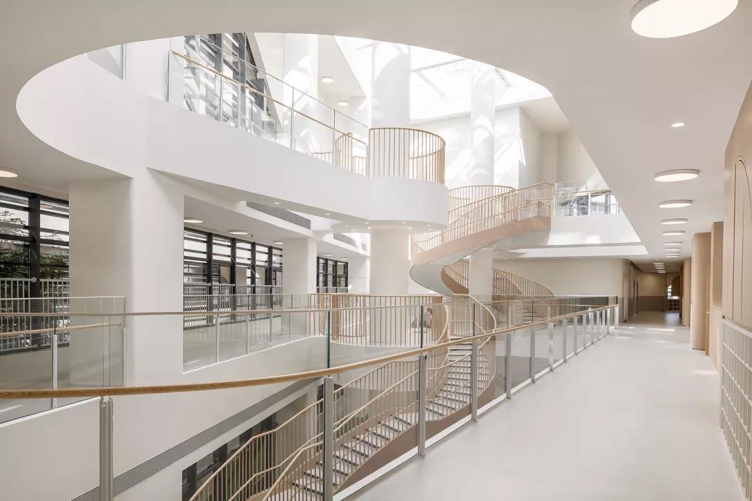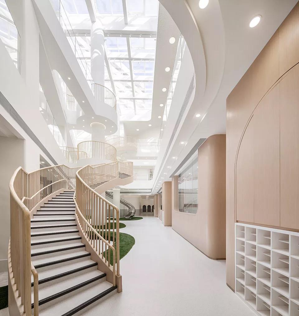 中庭利用保留結(jié)構(gòu)將“小樹(shù)林”搬進(jìn)了“郵輪”里,上下奔跑,在自然里穿梭。柱子成為樹(shù),梁成為橋,連續(xù)的樓梯和滑梯圍繞“樹(shù)”盤旋而上,激活各層空間。樹(shù)屋平臺(tái)作為閱讀角和手工角,是小朋友的專屬空間。全園以淺木色為整體基調(diào),大面積的超白透明夾膠安全玻璃創(chuàng)造出純凈、公平、寧?kù)o的空間環(huán)境。