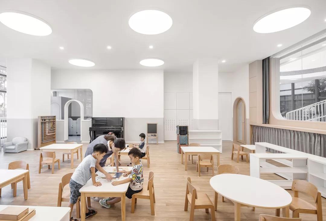 幼兒園設(shè)計(jì)充分考慮了2-6歲兒童在幼兒園生活與成長(zhǎng)的一切細(xì)節(jié),尺度以2-6歲幼兒為基準(zhǔn),并區(qū)分出1.5-3,3-6的不同年齡段。教室采用柔和的色彩和材料,創(chuàng)造像家一樣安全、溫馨的氛圍,鼓勵(lì)孩子們激發(fā)自我的潛能。