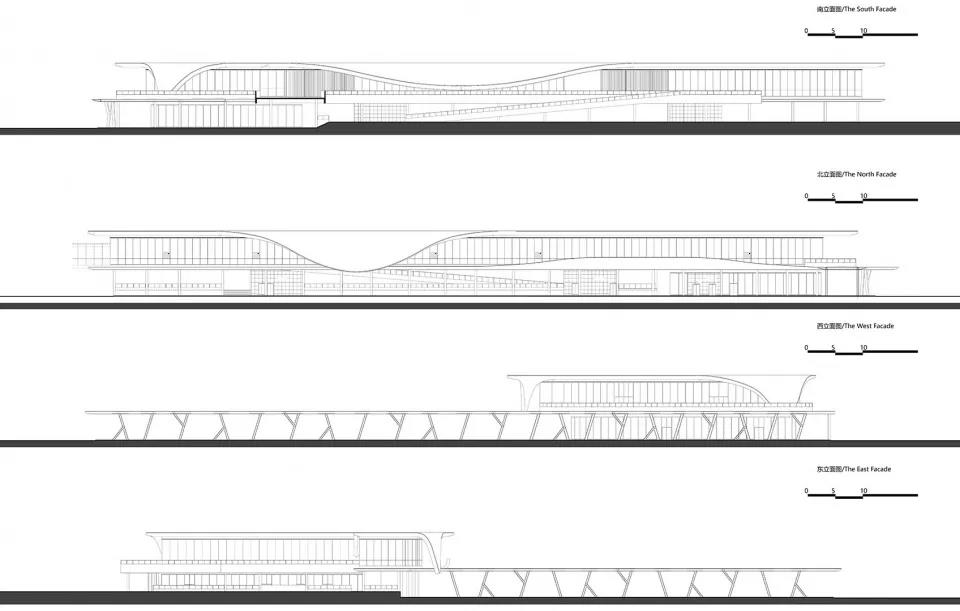 站房西北側的綜合樓通過層層的退臺向上延展而達到垂直綠化的目的。其平面呈弧形,立面以玻璃、鋁型材為主,精細的劃分展現出簡潔大氣的建筑形象。綜合樓部分采用覆土的營造手法,與地景設計結合的更加緊密。整個建筑如同從土地中生長出來一般,舒展著輕盈、柔和的體態將環境納入麾下。