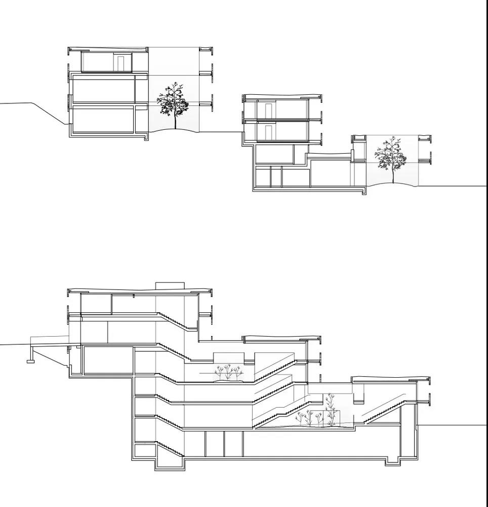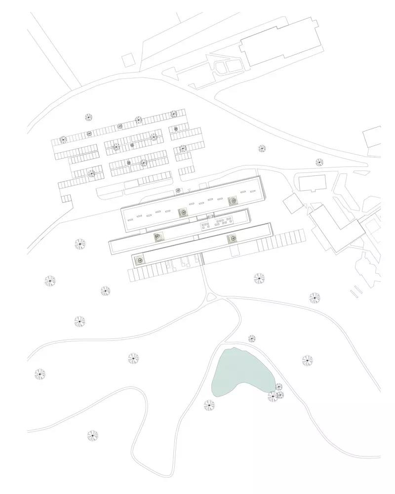 該項目將建筑與景觀融合在一起,旨在為該地區創造人與自然之間的和諧氛圍。設計場地屬于該地區典型的果園草地。三個狹長的結構被設置在類似競技場的場地中,使得建筑有時看起來像是盤旋在地面上,有時則是嵌入到地形中。