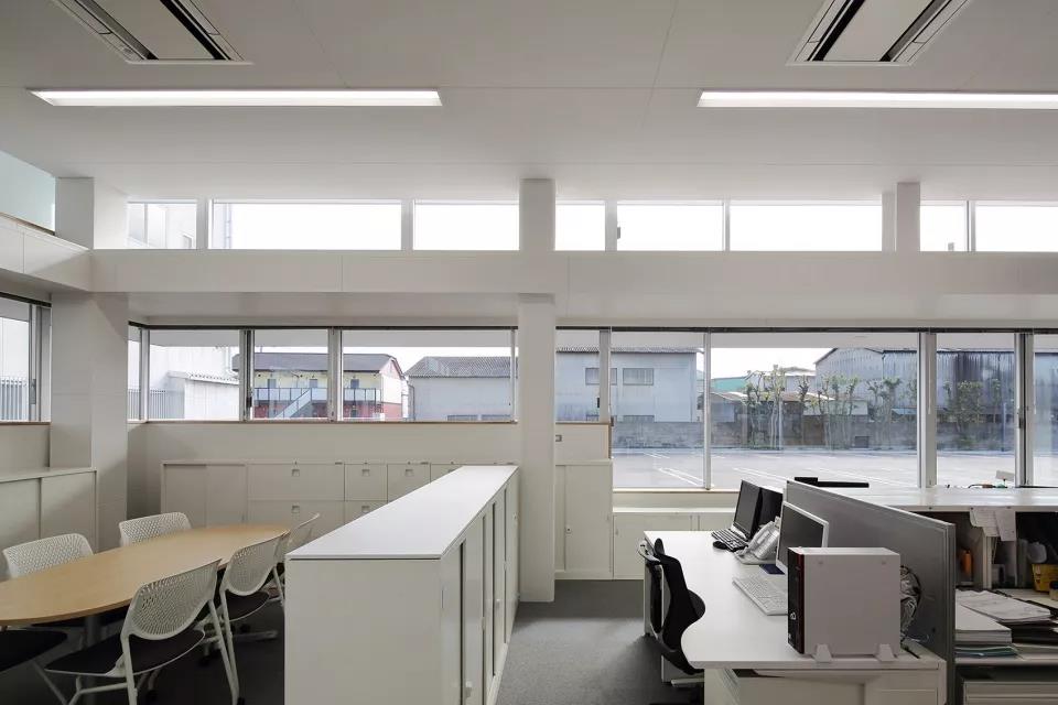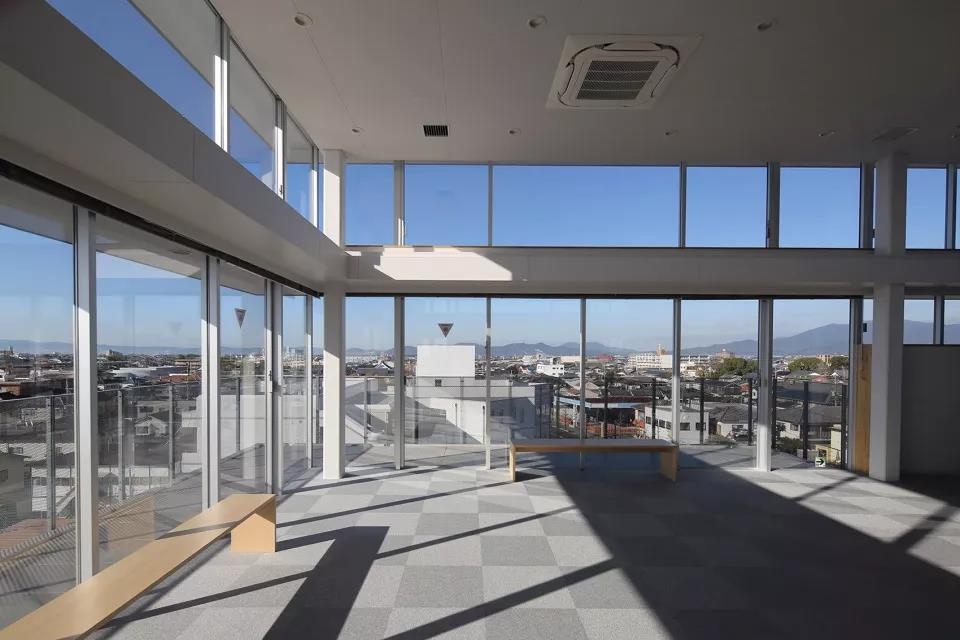 各層的窗戶大小各有不同,屋檐和露臺的寬度也根據空間的功能而有所變化。具體考慮的方面還有空間舒適度、與周圍建筑的關系、平面布局、朝向以及熱環境等。盡管辦公樓的面積十分有限,每層只有約12×12平方米,但與之相連的開放式大廳使得人們能夠在這里感受到周圍城市以及佐賀平原的廣闊風景。