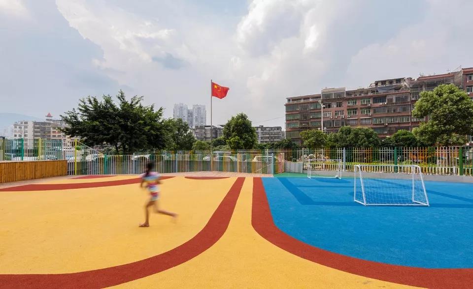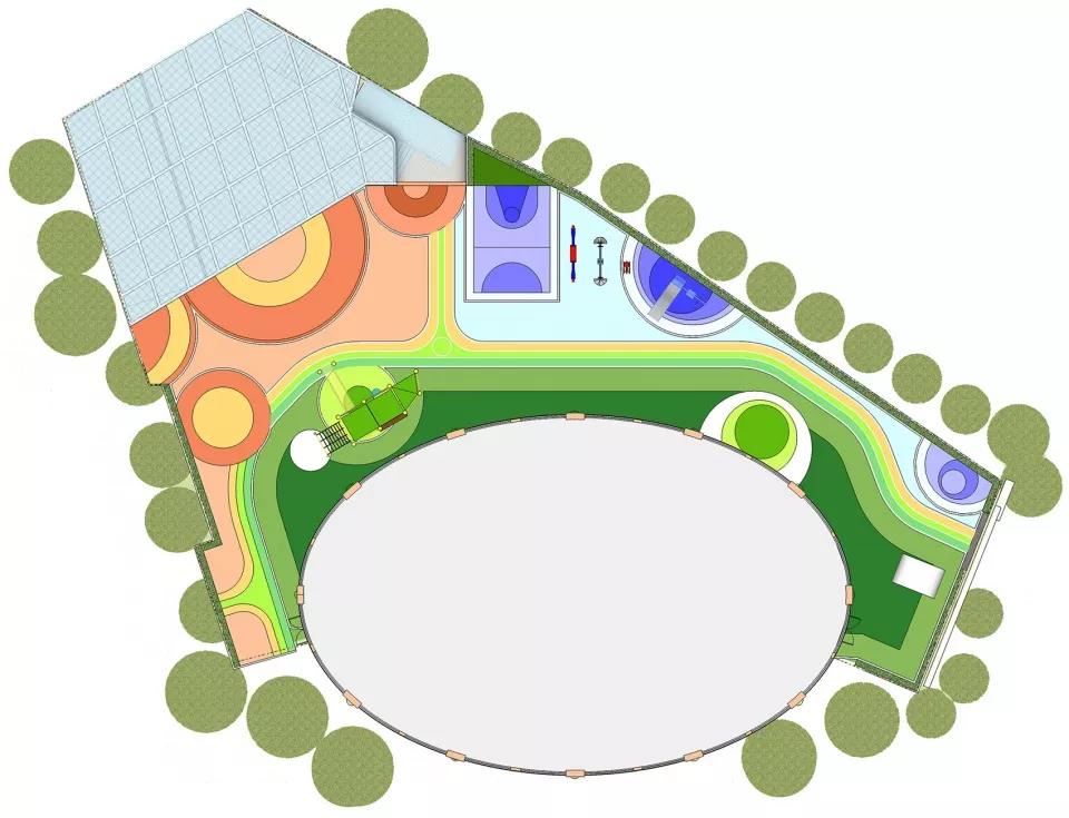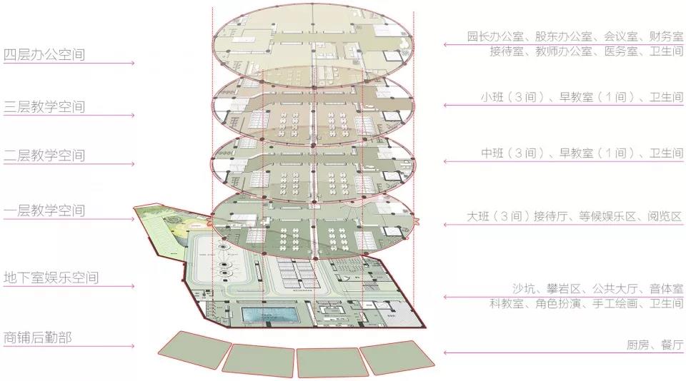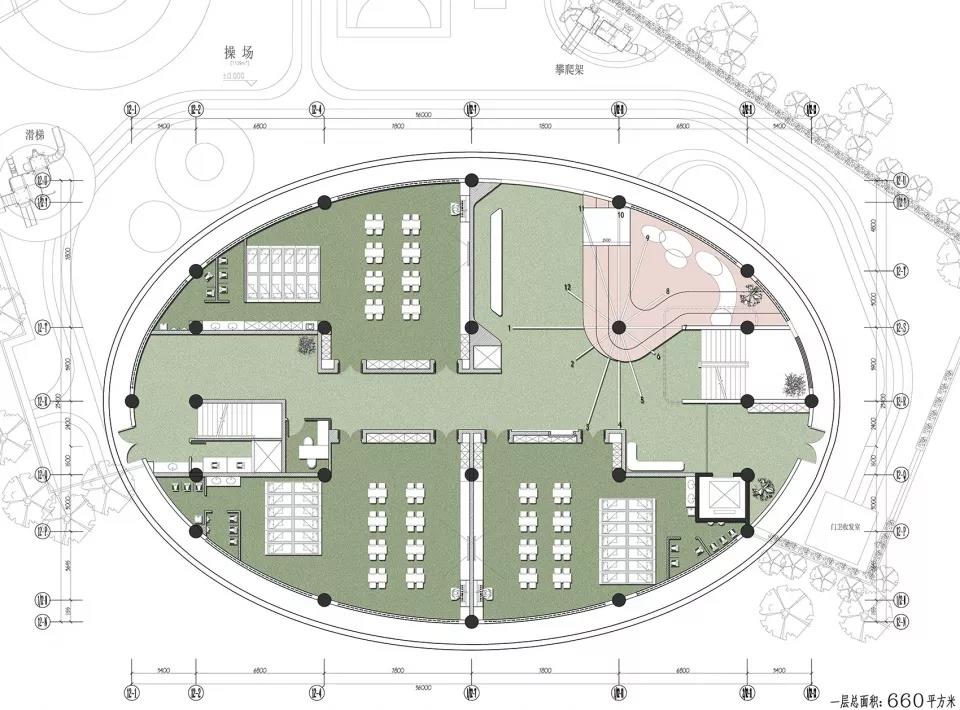 本案建筑為橢圓形結構,設計之前一直是陽光棕櫚城閑置已久的附屬樓,由于周邊缺少多樣化綜合性幼兒園,同時居民也希望能建設一個舒適安全、富有自然與創新的幼兒園,當地傳統幼兒園的教育模式、各種符號和顏色限制孩子們的大腦,我們希望脫離原有的花花綠綠、絢爛多彩的幼兒園概念重新設計。