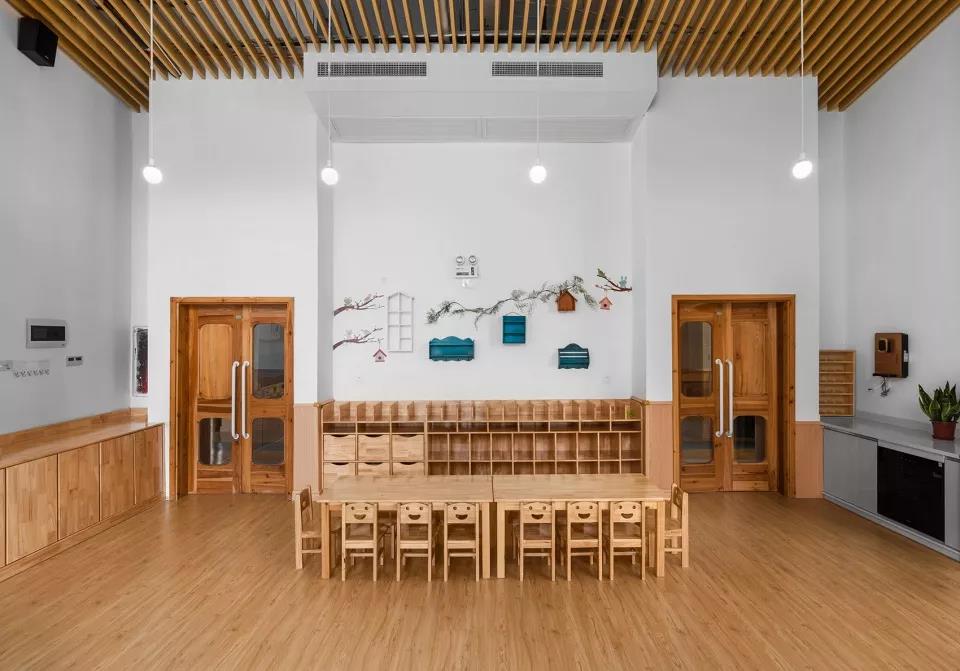 項目改造前原建筑窗都是大落地窗,保證充沛的陽光,依靠空間的層高優勢,利用貫穿空間的大樓梯,劃分出更多可以用來發展兒童天性的自由探索空間,一樓接待大廳作為孩子們進去室內的第一空間,地面為PVC地塑材料,一條跑道將公共空間和教室連接起來。大廳保留原有的圓形柱子加以“樹”的抽象造型修飾原建筑柱體,室內空間主要以白色、木色為主,樓梯閣樓處挑出空間用平臺與滑梯連接一樓的活動空間,增加“樹”與“樹屋”的空間趣味性。用簡單樸實的設計向孩子們展示出設計者和教育者的可持續性環保理念。