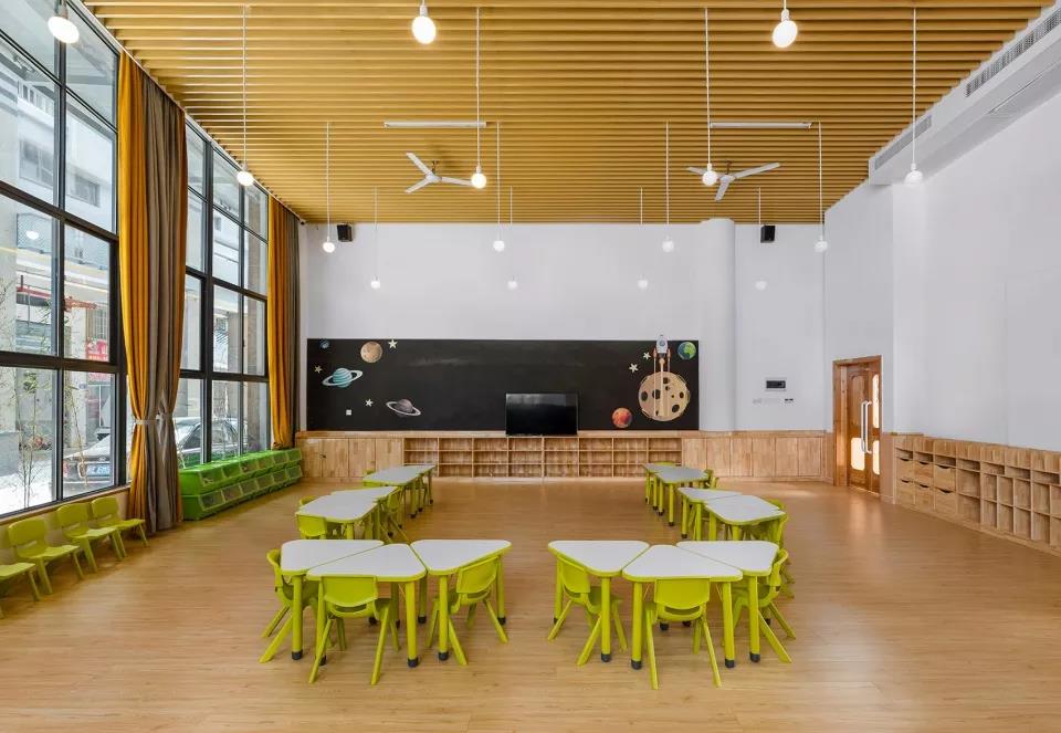 每個教室營造出一個小型演出或集體活動的空間。通過對空間的靈活化使用,在功能上對不同空間進行定位,豐富幼兒教育空間的教學內容,滑梯、兒童閱讀平臺、開放式兒童烹飪臺、整面涂鴉黑板墻設計及角色扮演區等分段式穿插在空間內,豐富的室內活動區域,不僅可以誘發兒童的探索心理,也讓他們可以自由選擇,根據自己興趣愛好去探索。