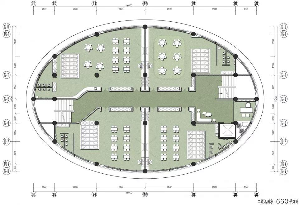 ▼一樓接待大廳,保留原有的圓形柱子加以“樹”的抽象造型修飾原建筑柱體