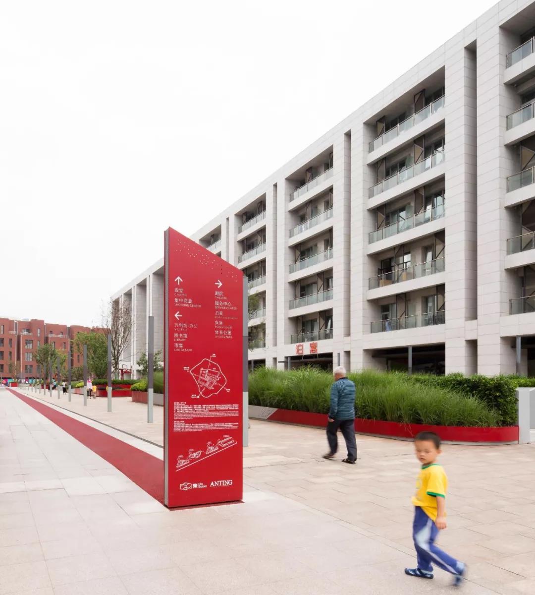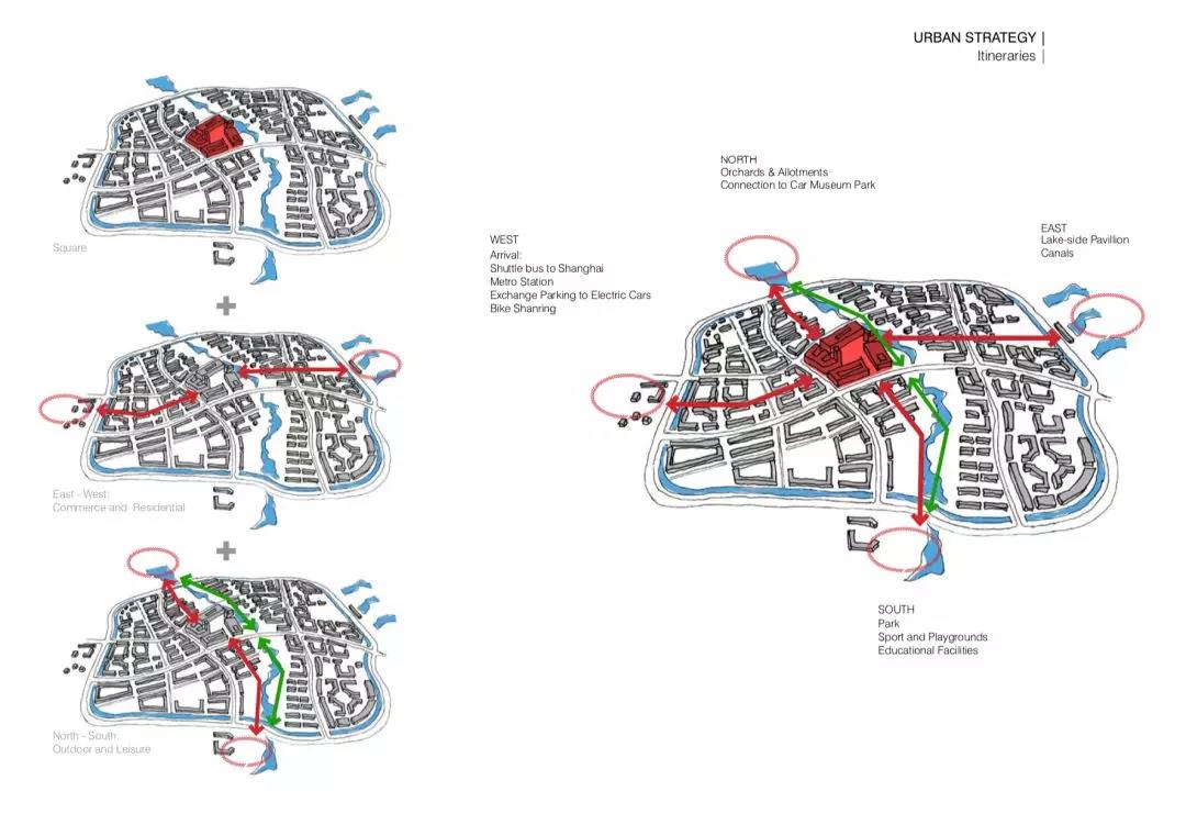 然而設計師經過調研發現,這方超大的廣場自有其玄妙之處——它的四條軸線各自指向特色、功能各異的空間:從廣場向北,軸線延伸至成熟的果園和配發地;向東是一灣湖泊和迷人的亭臺;向南是公園、兒童游樂場等體育鍛煉空間;而西側作為安亭中心內外交通的主要銜接點,則包括了地鐵站、接駁巴士總站、電動汽車停車場和自行車共享中心。
