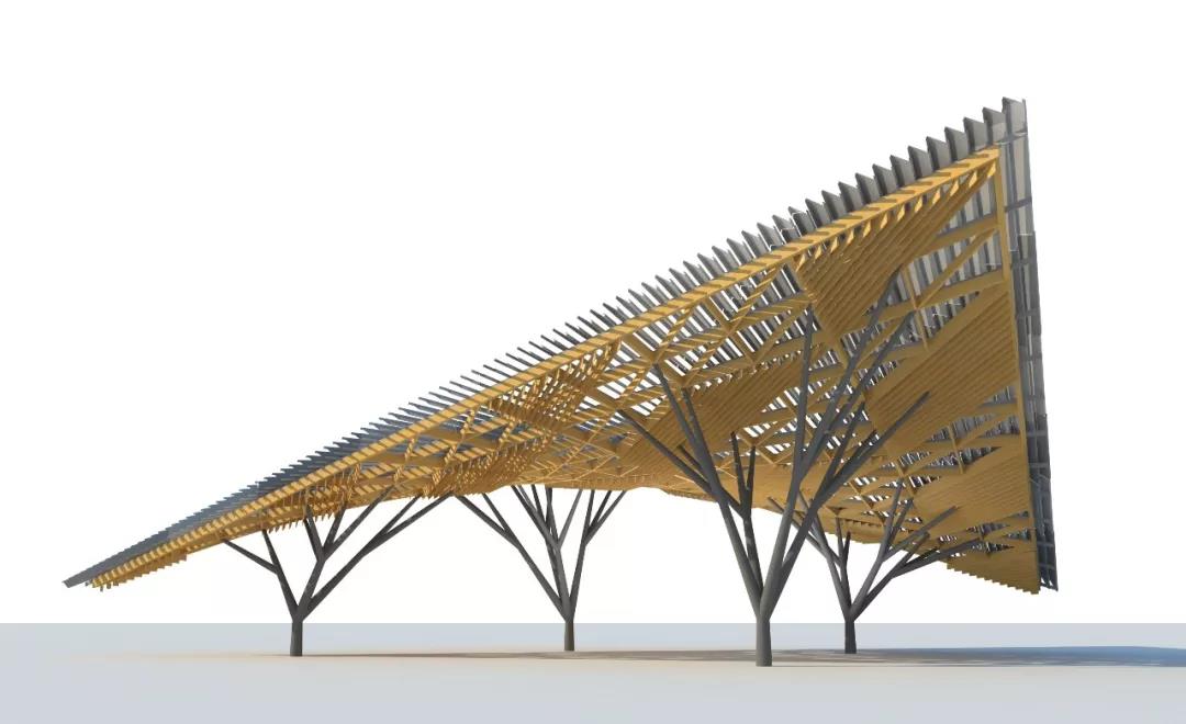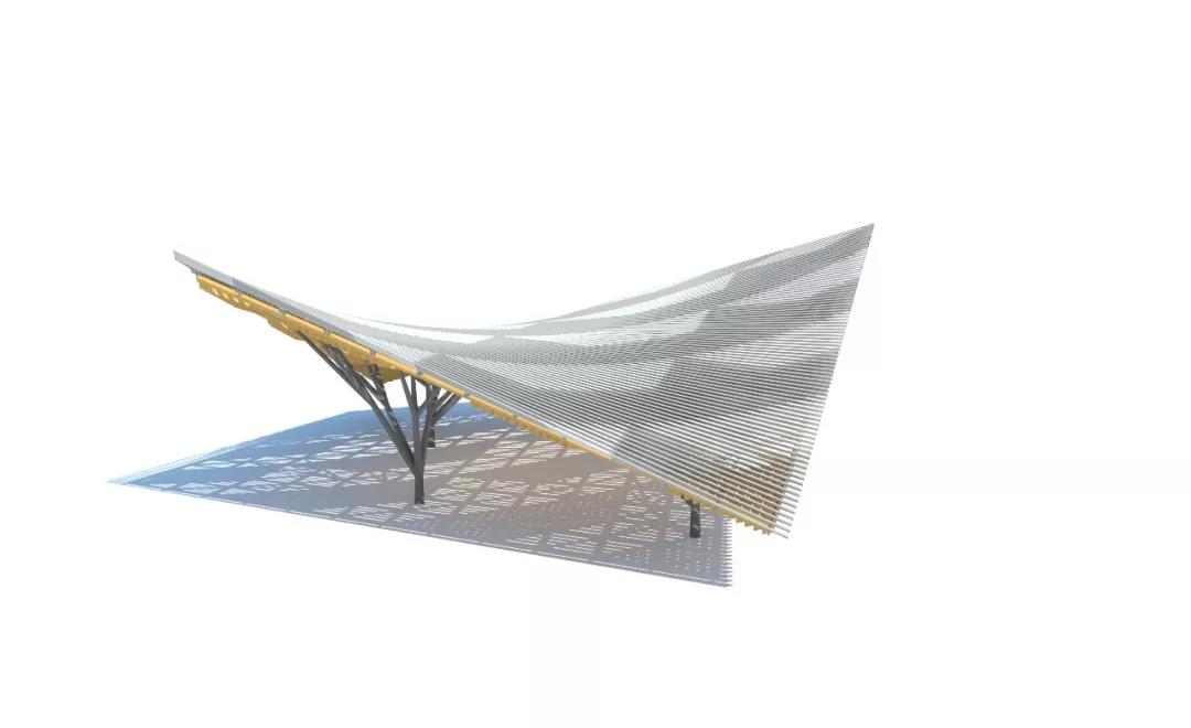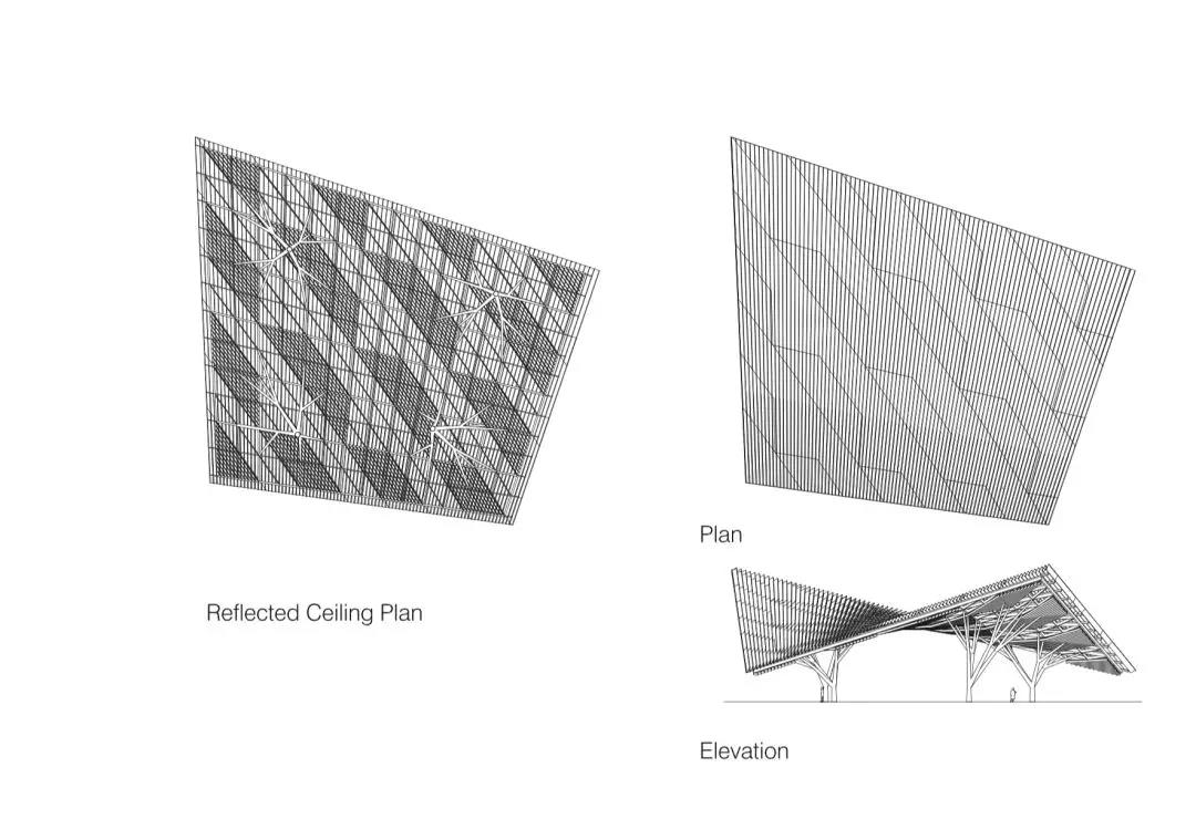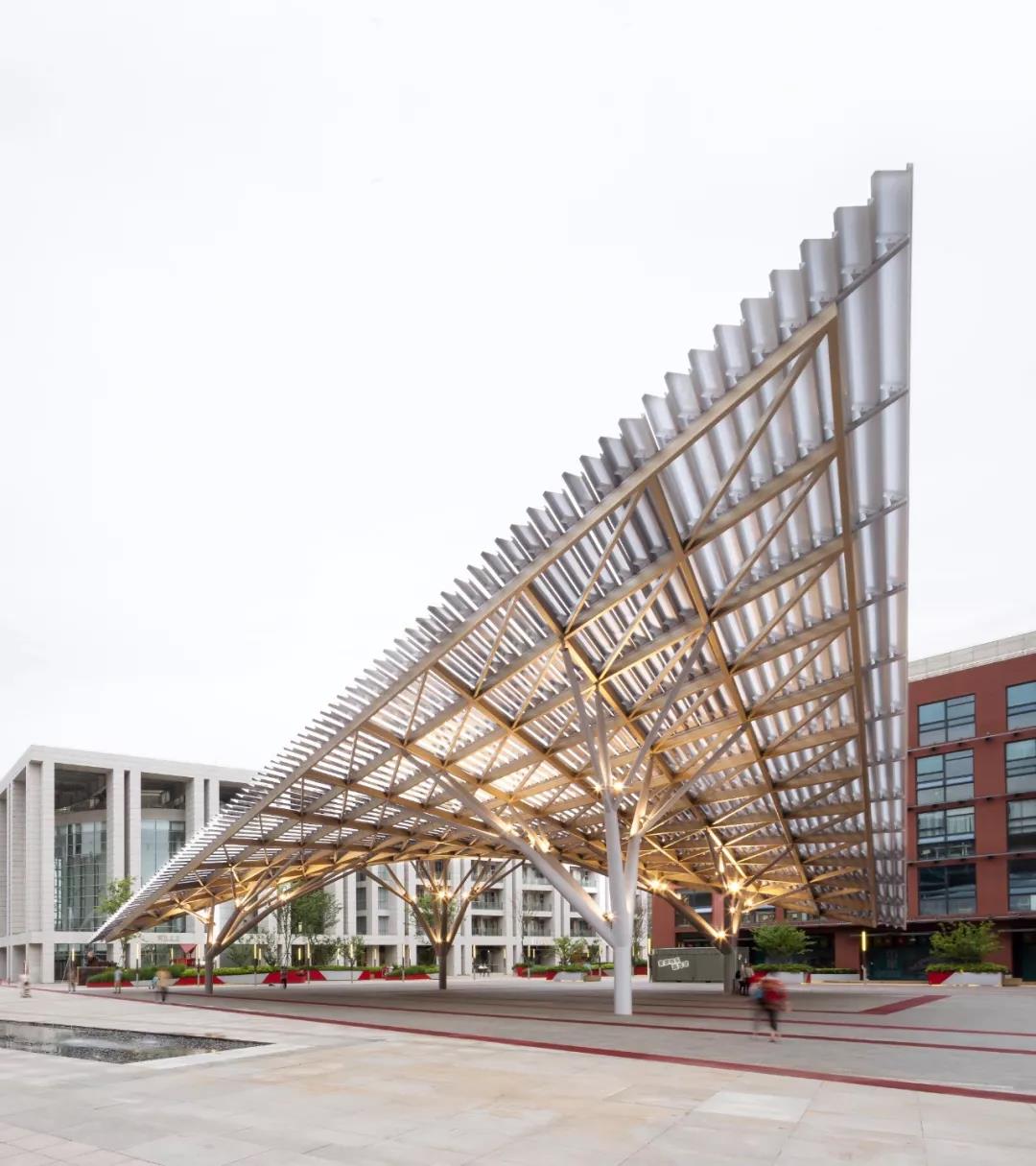 在設計上,亭頂像船帆一樣向上翹起,四邊不對稱,起角傾斜,給人以強烈的視覺沖擊力。它的幾何形狀設計得極為巧妙,從廣場的四條軸線看它,其形狀各不相同。亭頂百葉更進一步創造了精彩的視覺效果:從某些角度來看,中央景觀亭竟像是透明的一般。