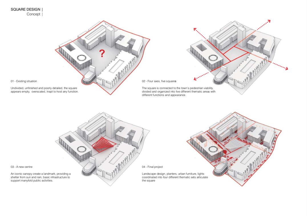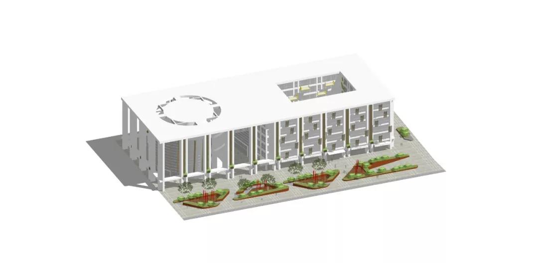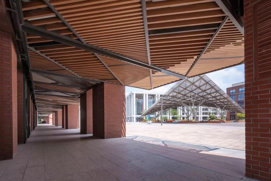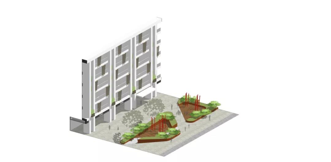 將這四個不同的空間統一在一起的是廣場的中央景觀亭。作為場地的標志性建筑小品,它具有多種功能:為亭下創造“舞臺”式的活動空間、遮陽擋雨、也可以用作臨時的公共籃球場。