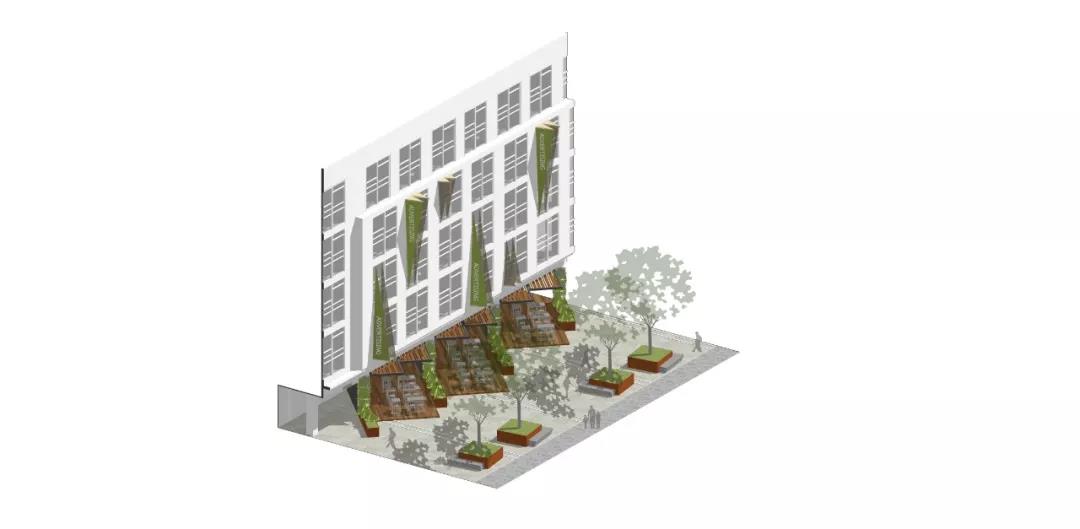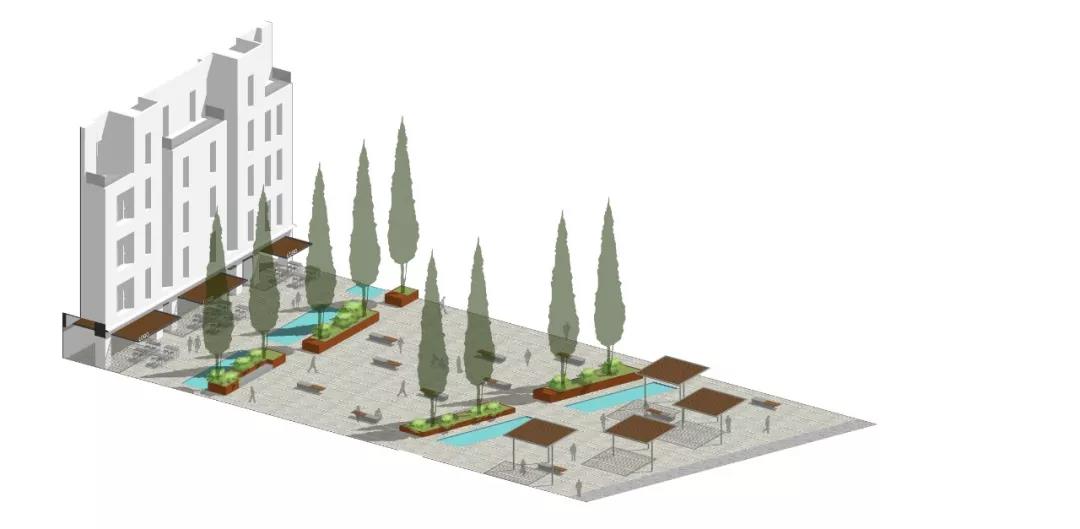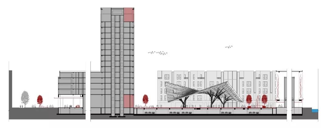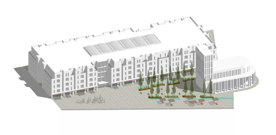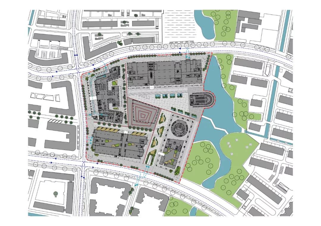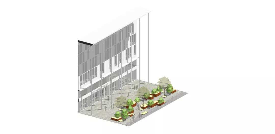 西側道路是切入廣場的主要入口,它連接著安亭游覽的基礎設施。考慮到這一點,Kokaistudios將其建筑的立面開放給更多的商業空間,擴大了步行區域并為餐飲場所設置了露臺休憩座位。