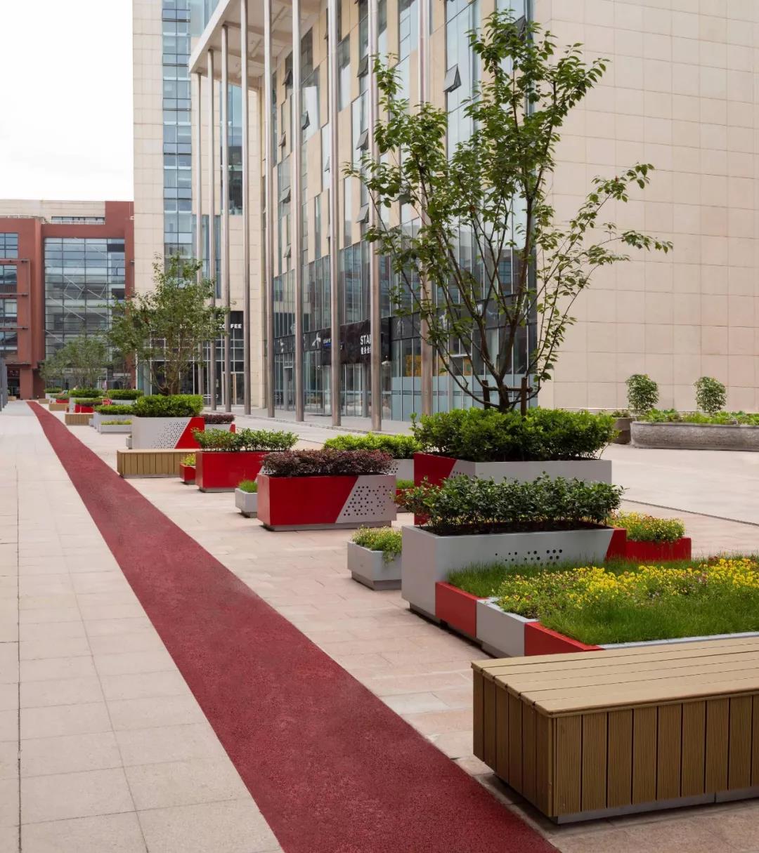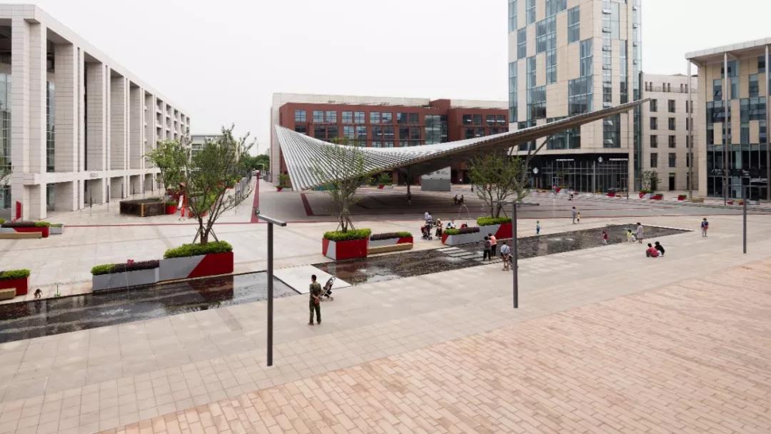 設計用紅色的瀝青清晰描繪出廣場四條軸線的物理邊界,并使之與中央景觀亭相聯,構成五大元素。這些線條辨識度極高,看上去是像是“紅毯”一般,引導游客進入廣場中心。