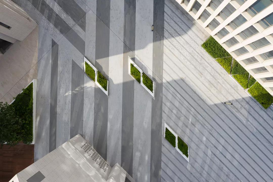 ▼建筑立面上的線性元素得以從立體空間延展到地面空間