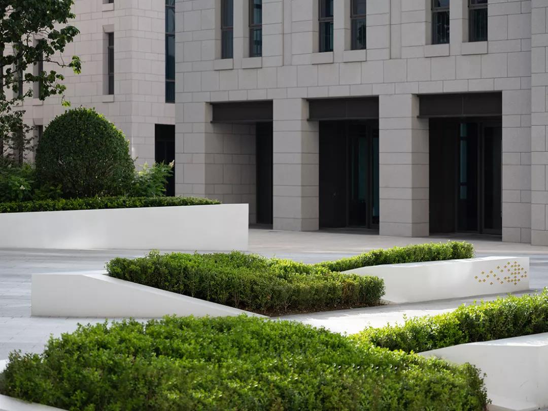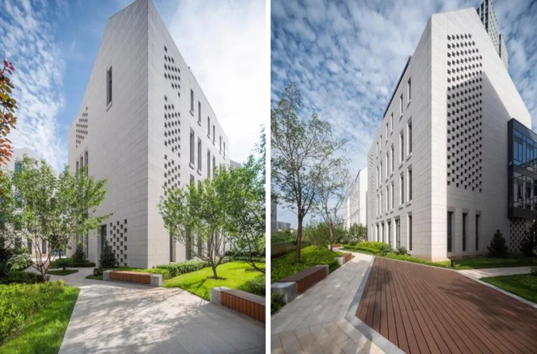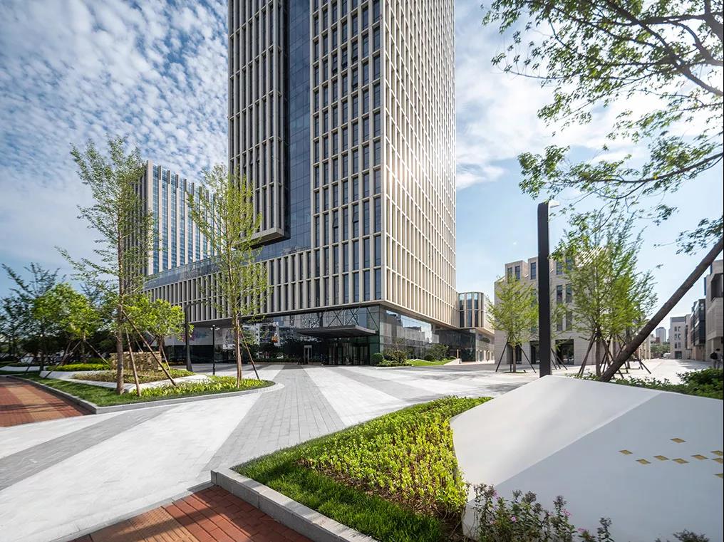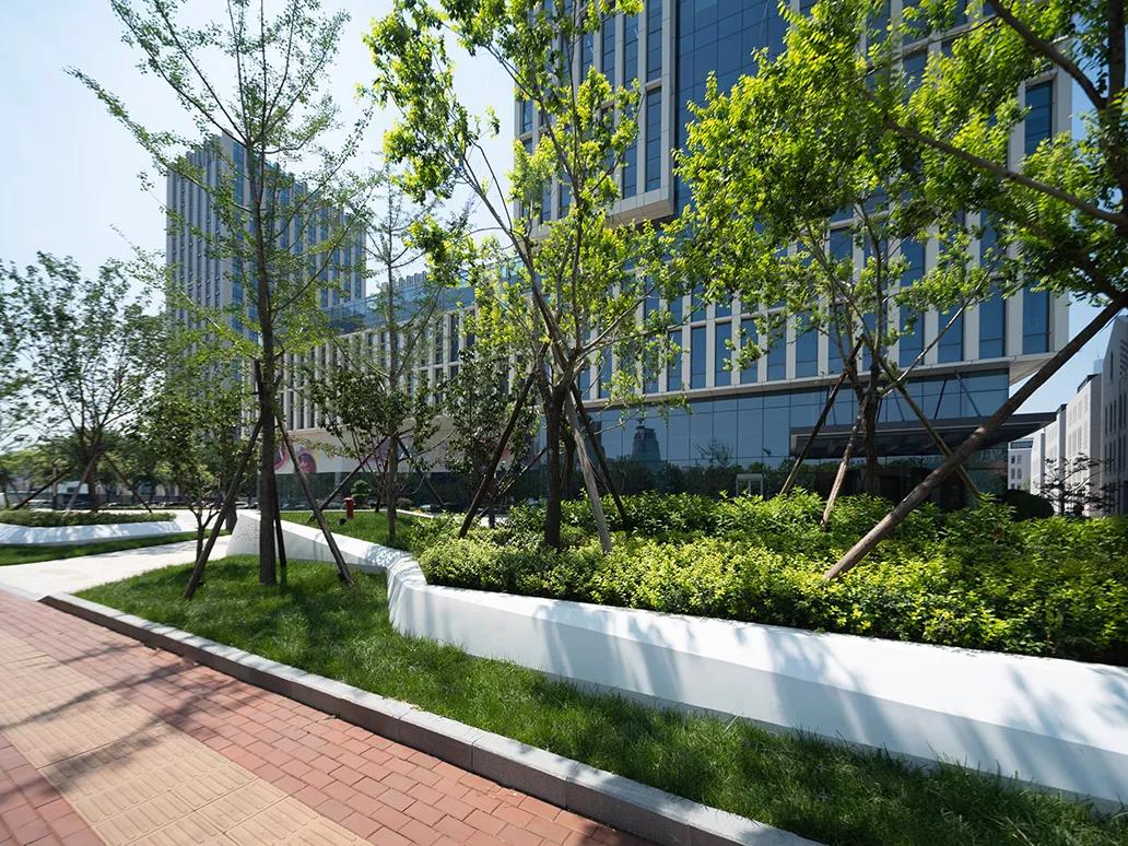 獨(dú)棟辦公區(qū)的步行景觀包括兩側(cè)建筑的山墻空隙的灰空間,滲入步行街內(nèi)部,從視覺上和空間上創(chuàng)造雙重體驗(yàn),令人移步換景,心曠神怡。獨(dú)棟辦公的帶狀后花園,采用草坪加細(xì)膩感強(qiáng)的地被和灌木,營造溫馨的休憩空間。景觀節(jié)點(diǎn)處都有供人停留的景觀休閑座椅,景觀視線開闊,使得整個(gè)區(qū)域擁有良好的通透性。