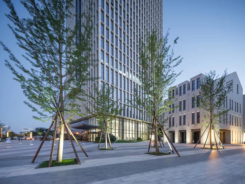 入口廣場的銀杏樹陣與建筑的挺拔雄壯相映成趣,同時(shí)考慮秋天的色葉變化營造場景氣氛。