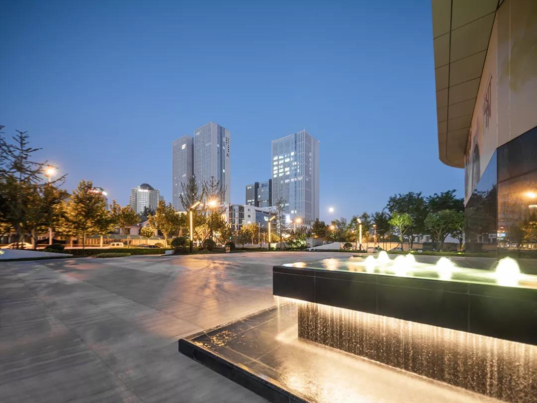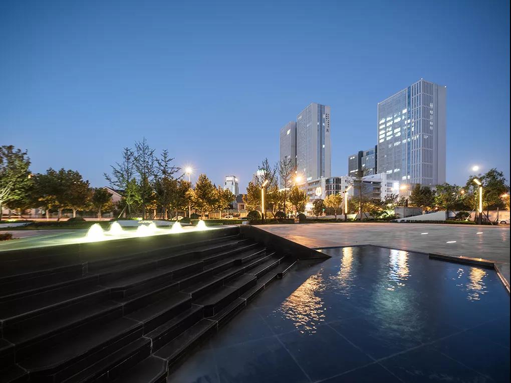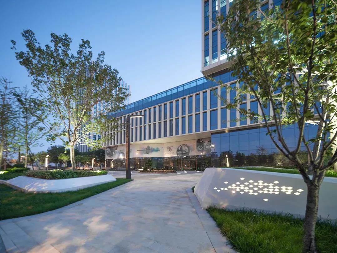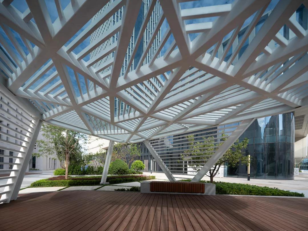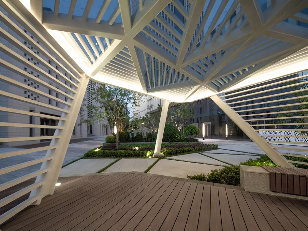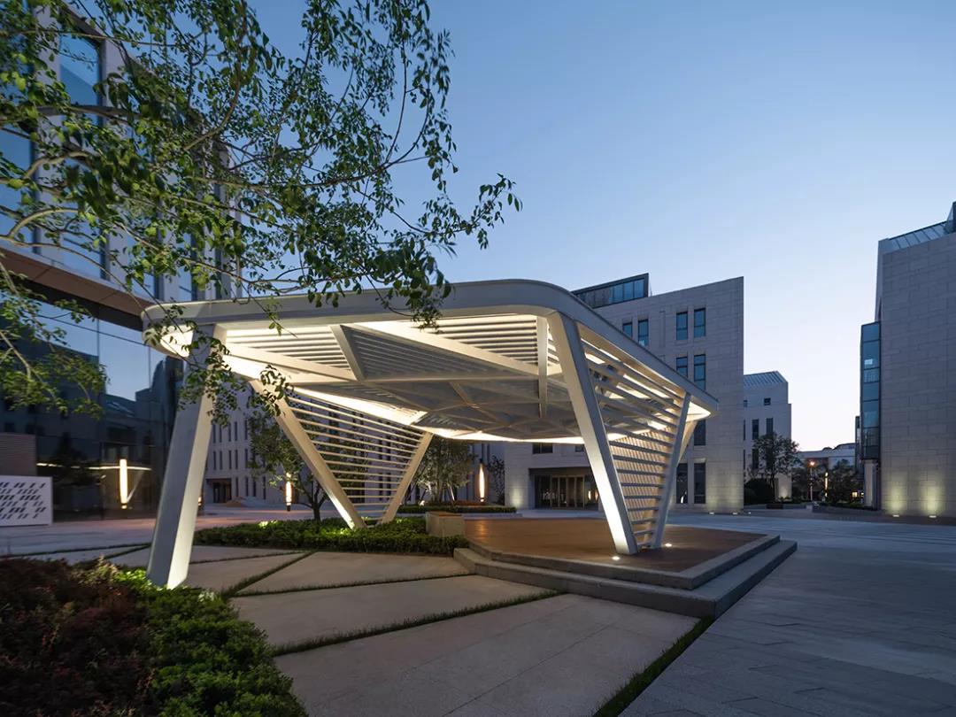 夜景中,序列感的燈光使得整個(gè)區(qū)域充滿科技感。廊架、植物、燈光以及室外家具的都以簡潔現(xiàn)代設(shè)計(jì)風(fēng)格,點(diǎn)綴于相應(yīng)的主題空間,以最少的設(shè)計(jì)體現(xiàn)最具空間可能性和靈活性的目的,使商務(wù)人群得到一個(gè)富于精神趣味和小驚喜的空間。