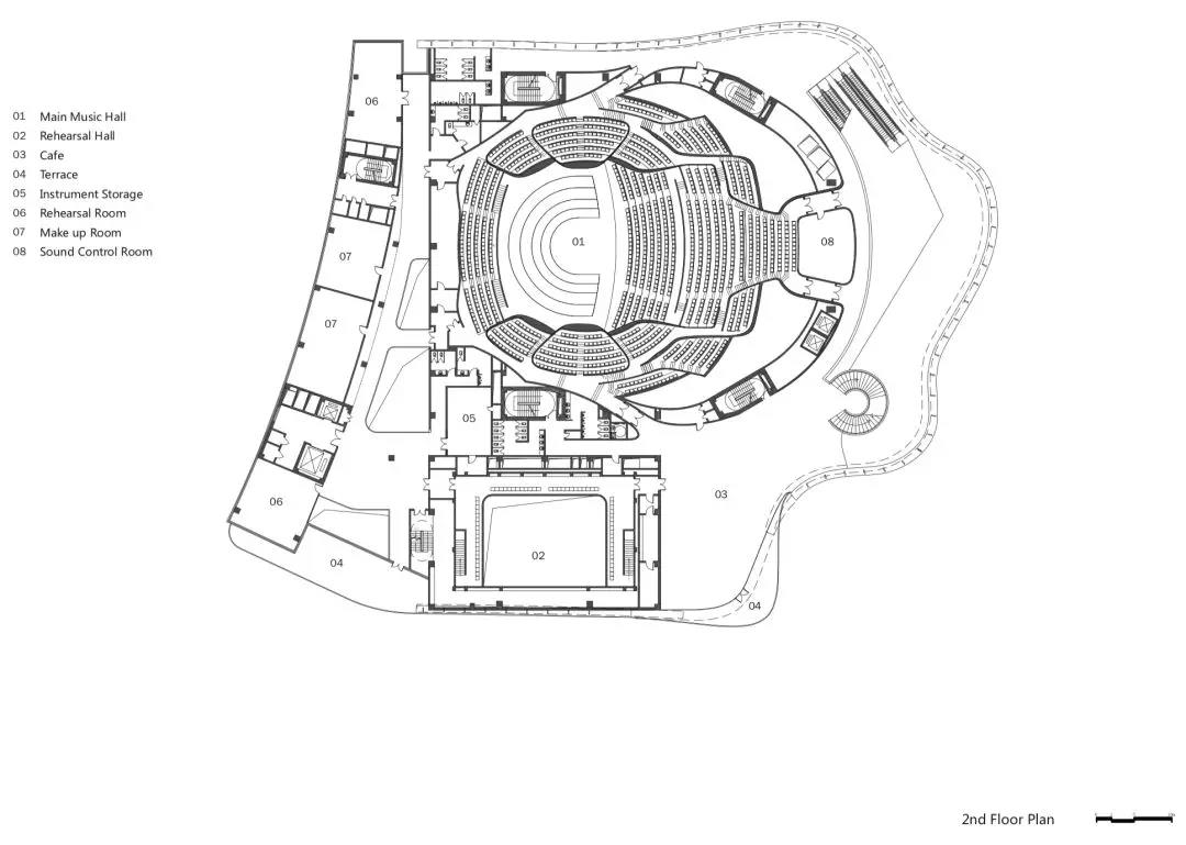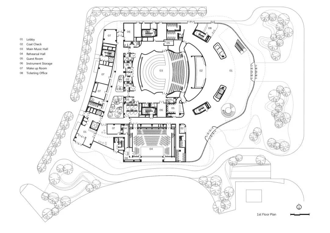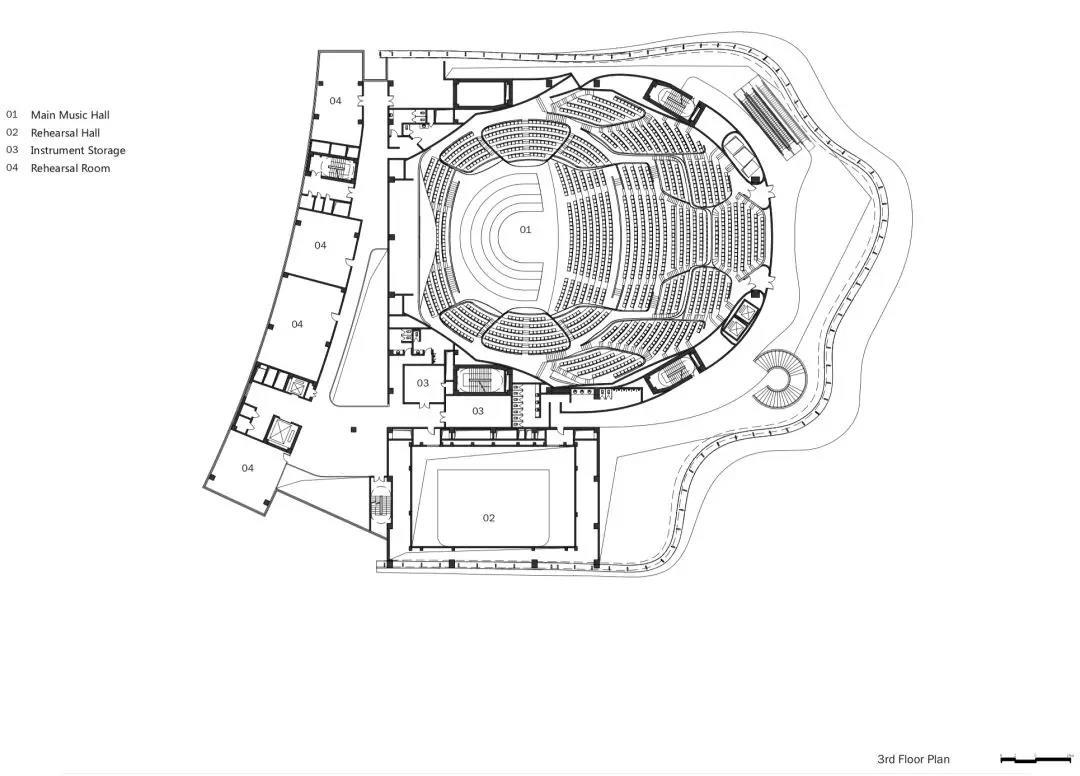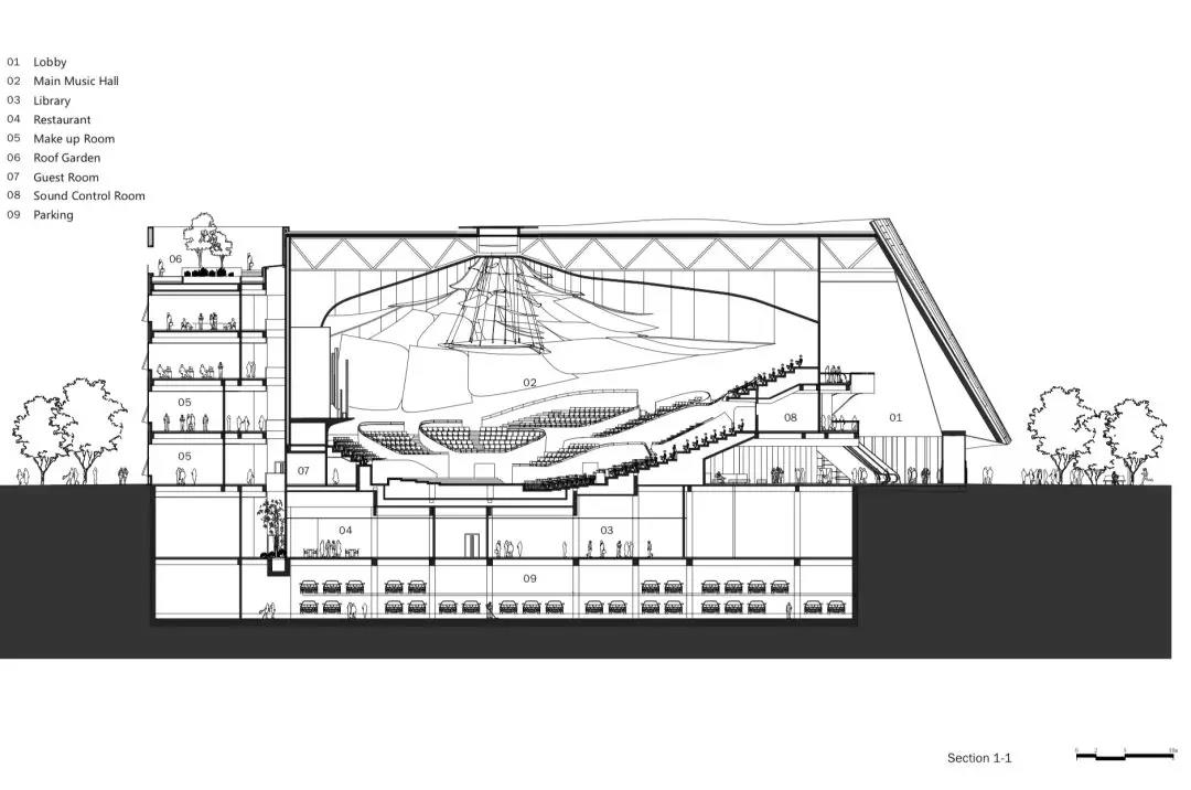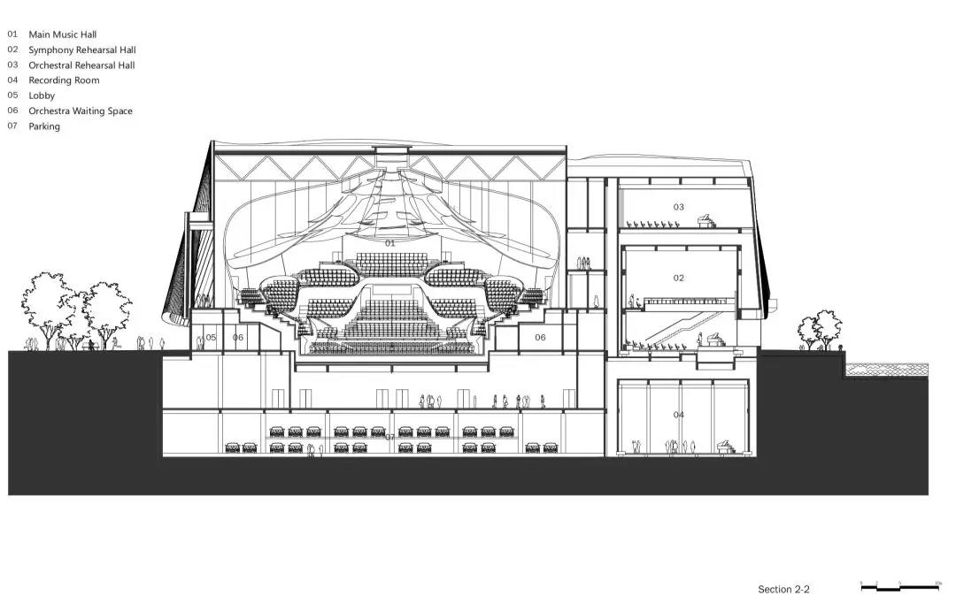 臨近南側(cè)的荷花池,音樂廳同時設(shè)置了400座的大排練廳。內(nèi)部墻面采用的深色多曲度木墻用于聲音反射和吸收,可提升的舞臺后反聲板可以將室外的自然光和綠色帶到室內(nèi)空間。音樂廳的其它組成部分還包括一個專業(yè)大錄音棚,及中國愛樂樂團的駐團辦公空間、排練廳、圖書館、資料室和檔案室等輔助功能空間。