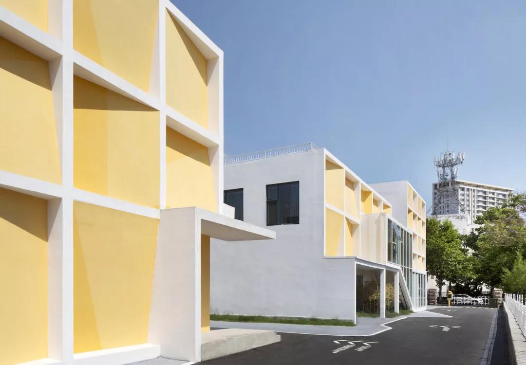 被賦予正面性的東立面山墻采用的是簡潔樸素的方格子語言,我們通過格子內墻面傾角的變化帶來了對整個東立面的藝術化處理。內墻面的深淺橙******模擬不同傾角下陰影的投射,而在一個陽光明媚的早晨,不同的時間段也有著豐富有趣的光影效果。這種大面積白墻和橙******的傾斜墻面的對比,也呼應了碧海藍天下文藝范兒的城市氣質。