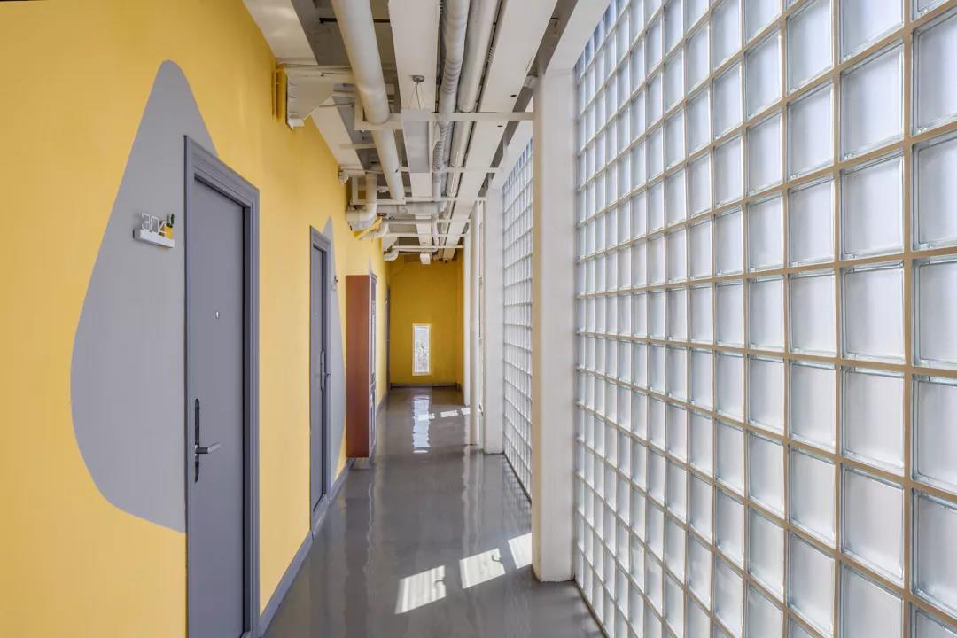 ▼走廊的外墻面為極具文藝氣質的玻璃磚,半透明的玻璃磚墻和新增的入口門廳一起形成了一個內向的靜謐庭院