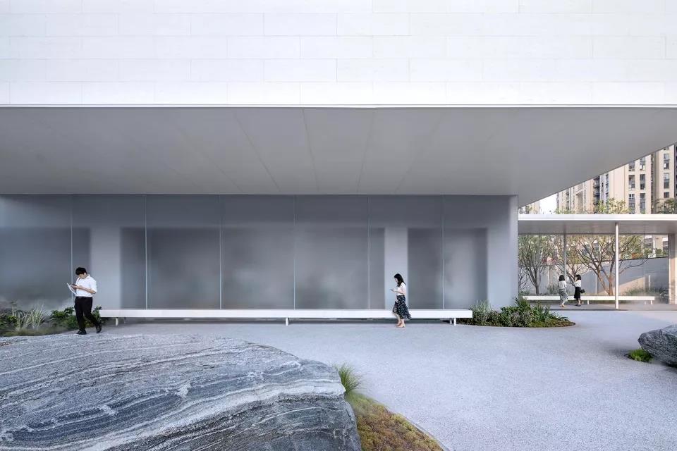▼利用圍墻形成開放的景觀廊架,玻璃立面向行人展示建筑內景觀