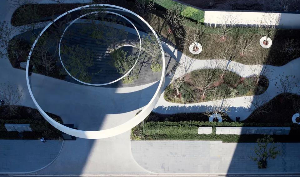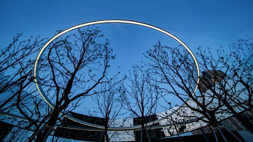 星光圓環是場地設計的一個亮點。一大一小,一厚一薄的兩個圓環,限定出公園入口的界面。圓環的頂點離地面6米,夜晚在空中形成一條星光密布的光帶,穿行在烏桕林中,成為這個小公園的標志。大圓環的內側為360°鏡面,把懷抱其中的幾株烏桕無限次的反射,形成無窮盡的森林意向。