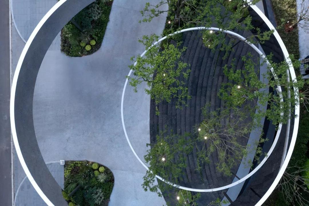 林下庭院由一片烏桕樹和一個模擬的小山體以及一個“星光圓環”構成。烏桕林以4-5米的間距種植,以便林下的空間游人可以自由穿行,甚至孩子也可以奔跑嬉戲。模擬的小山體以森林公園拾級而上的臺階為元素,樹木穿梭其間,小草從石縫中長出,一方面解決居住區圍墻與小公園之間的視線落差,也形成了獨特的視覺記憶和空間體驗。