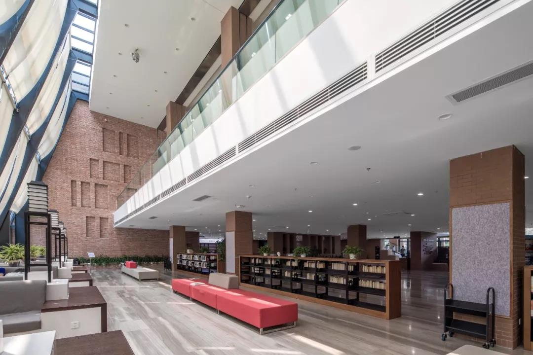 設計充分體現(xiàn)了當代高校圖書館發(fā)展的趨勢,在功能上補充了圖書館大開間閱覽室的不足,增加展廳、咖啡廳、開放書店、小組討論空間、研修間、古籍修復區(qū)等新功能。同時在不同標高層設置若干貫通數(shù)層的公共空間,串聯(lián)起整個室內(nèi)外空間流線。
