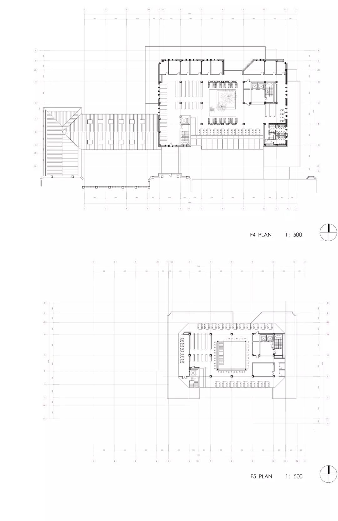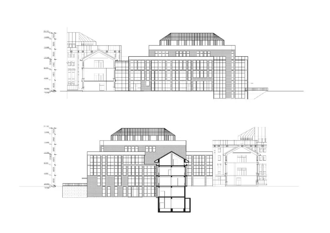 建筑基于上部逐層內(nèi)收的形體處理,在平面組織上發(fā)展出內(nèi)、外兩層的空間嵌套關系。形體與平面的設計邏輯,被真實地表現(xiàn)在建筑立面上:在最外沿3層高的通透表皮之內(nèi),包裹著保持了分隔與滲透平衡的、更具實體感的4層高的墻體。