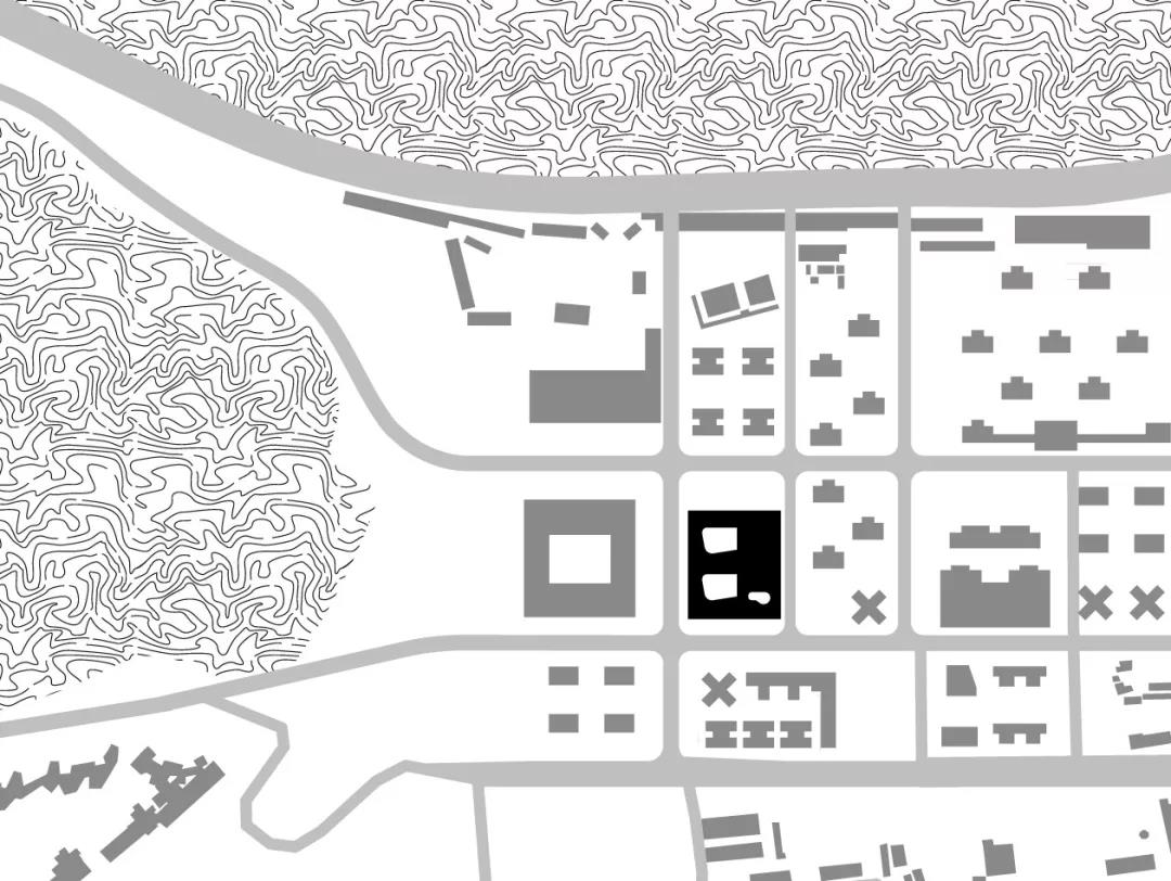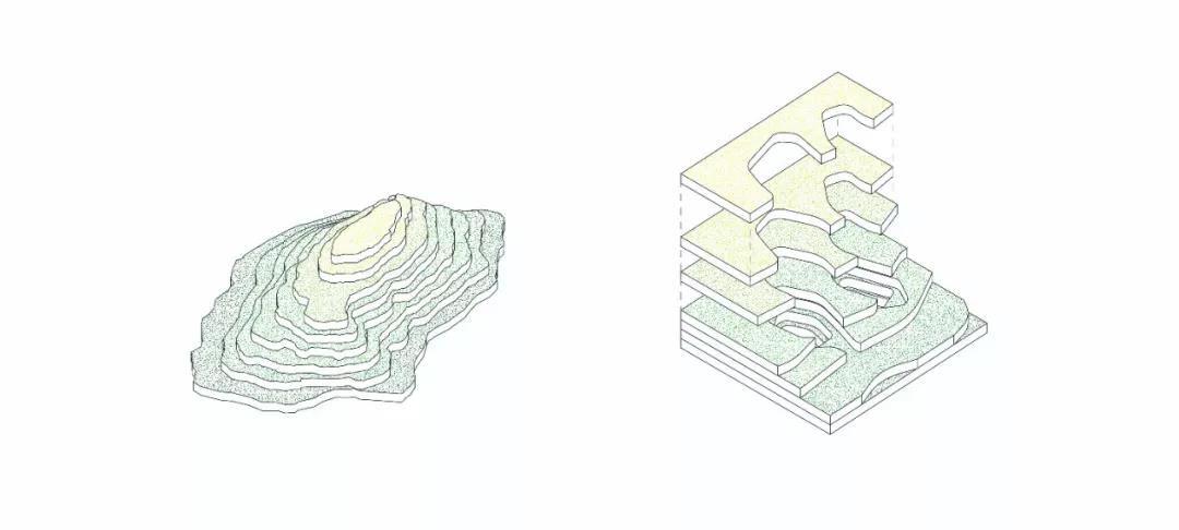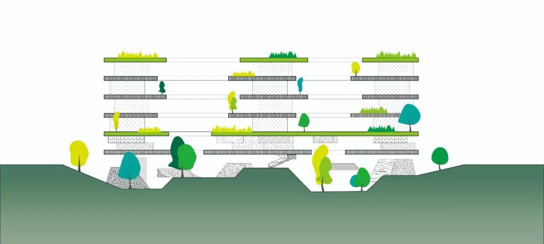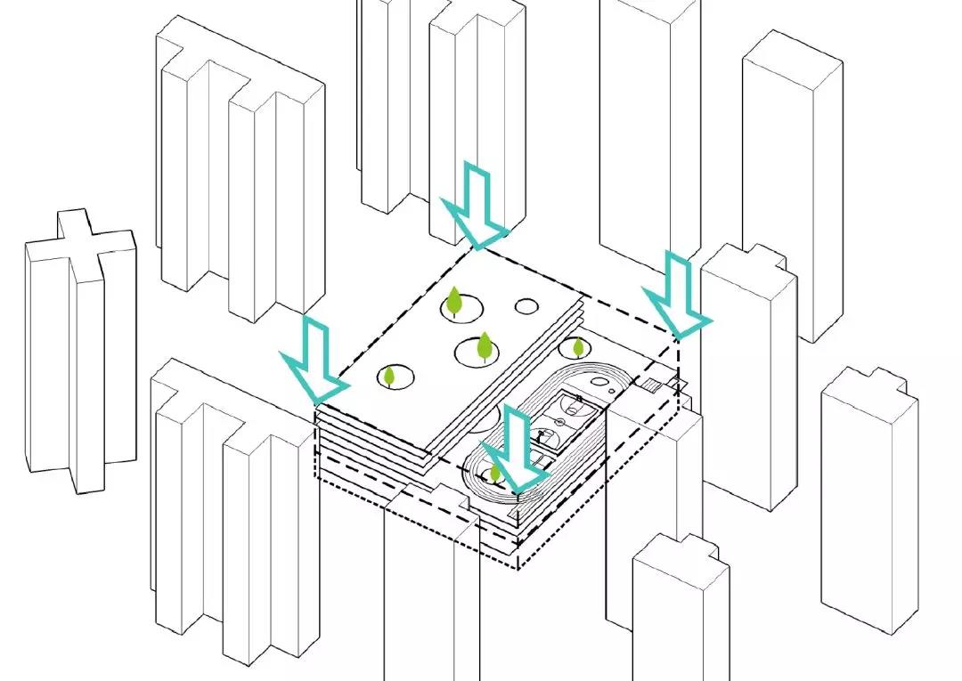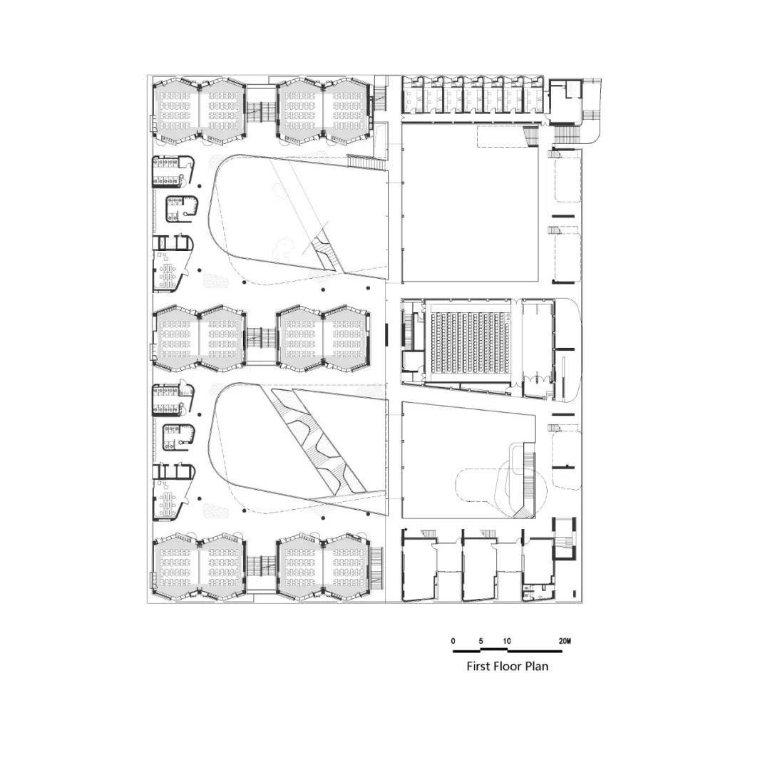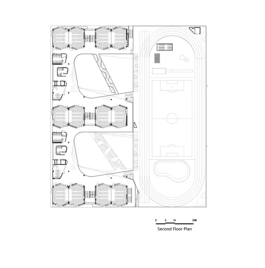 教學建筑幾乎滿鋪可以建設的用地,建筑分為東西高度不同的兩個半區,平面上以兩個鏡像的E字形連接。西半區利用學習單元之間所必須的間距創造出兩個曲線形邊界的“山谷”庭院。庭院下沉至地下一層,結合由道路退縮距離中取得的邊坡綠化,為地下一層的文體設施和餐廳空間爭取充足的采光和自然通風。