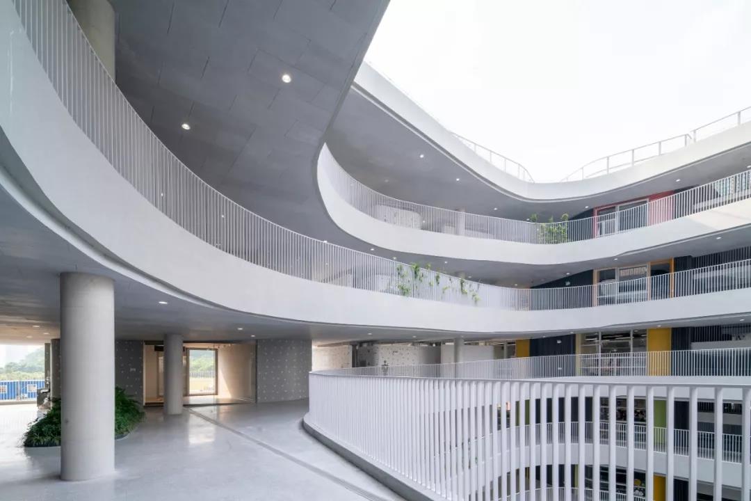 鼓形平面展現出比傳統矩形學習單元更大的靈活性與自由度,更有利于單元課室里面的多樣化的教學模式。課室經過連接后產生的富有韻律的折曲線與各層樓板在內庭院一側的自由曲線間形成的線性活動場地,為小朋友們課間提供了一個富有活力的半戶外活動場地。