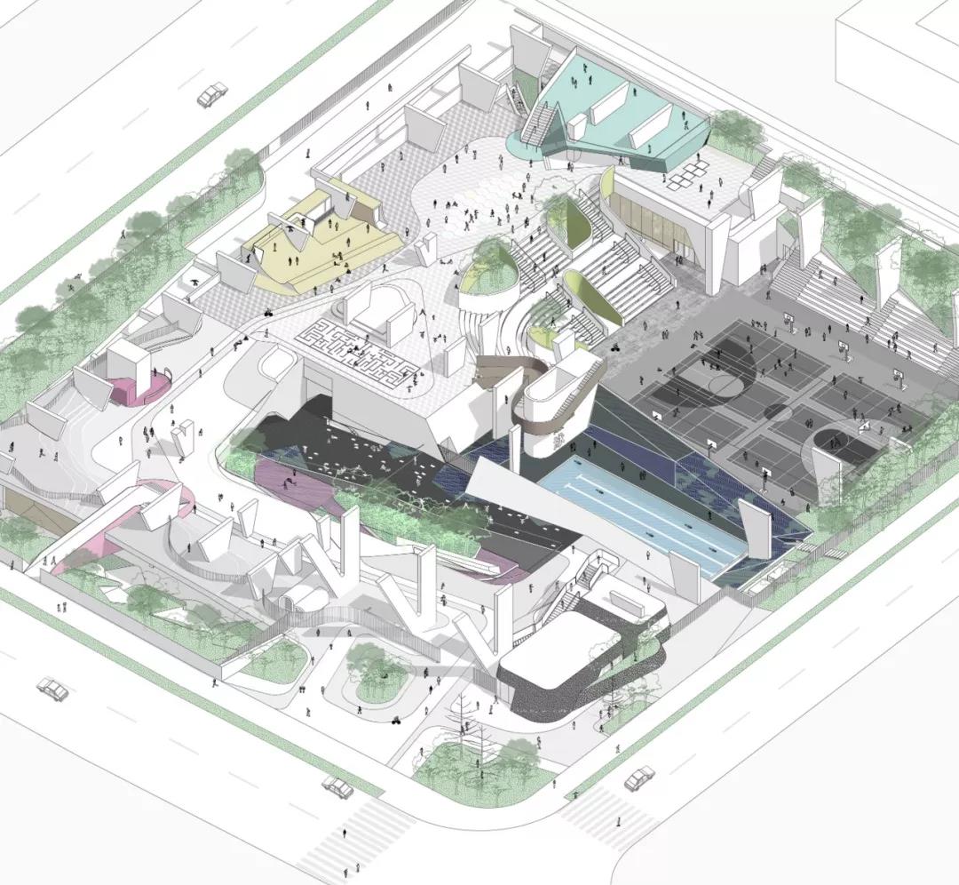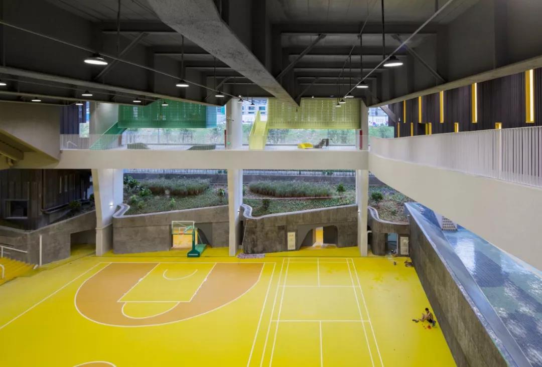 下沉庭院通過緩坡和露天階梯劇場與架空且自然起伏的首層地面連接成為一個整體的地景兒童樂園。200米環形跑道和運動場被置于建筑東半區三層屋面,與西側主教學建筑的三層平面相連,便于在二、三、四樓上課的小學生們課間到運動區域活動。