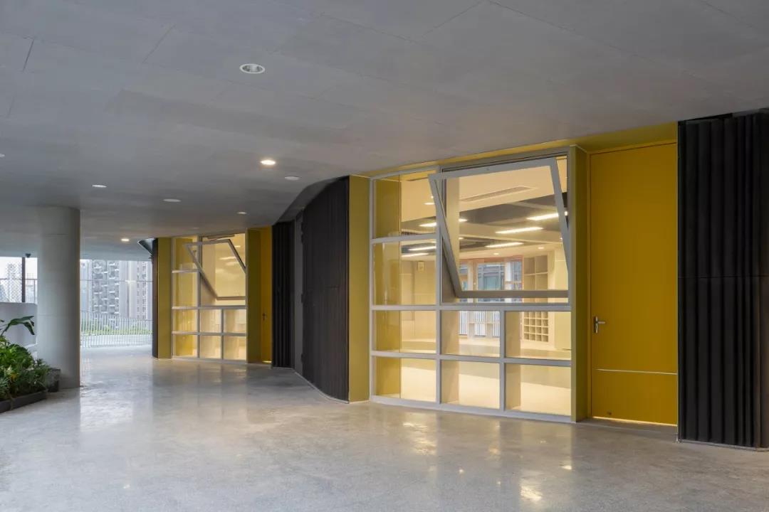 學習單元——傳統上稱為課室,是小學生們學習和交往基本空間細胞單元。建筑師針對深圳所在的亞熱帶氣候在水平的E字形板式樓層平面上構想了成對組合的鼓形平面的教學單元,避免課室過長的連排阻隔自然通風。每層12間課室分3列共6對布置。每個單元對組合可以通過開閉連接部的靈活隔斷以滿足合班和分班等不同空間需要。