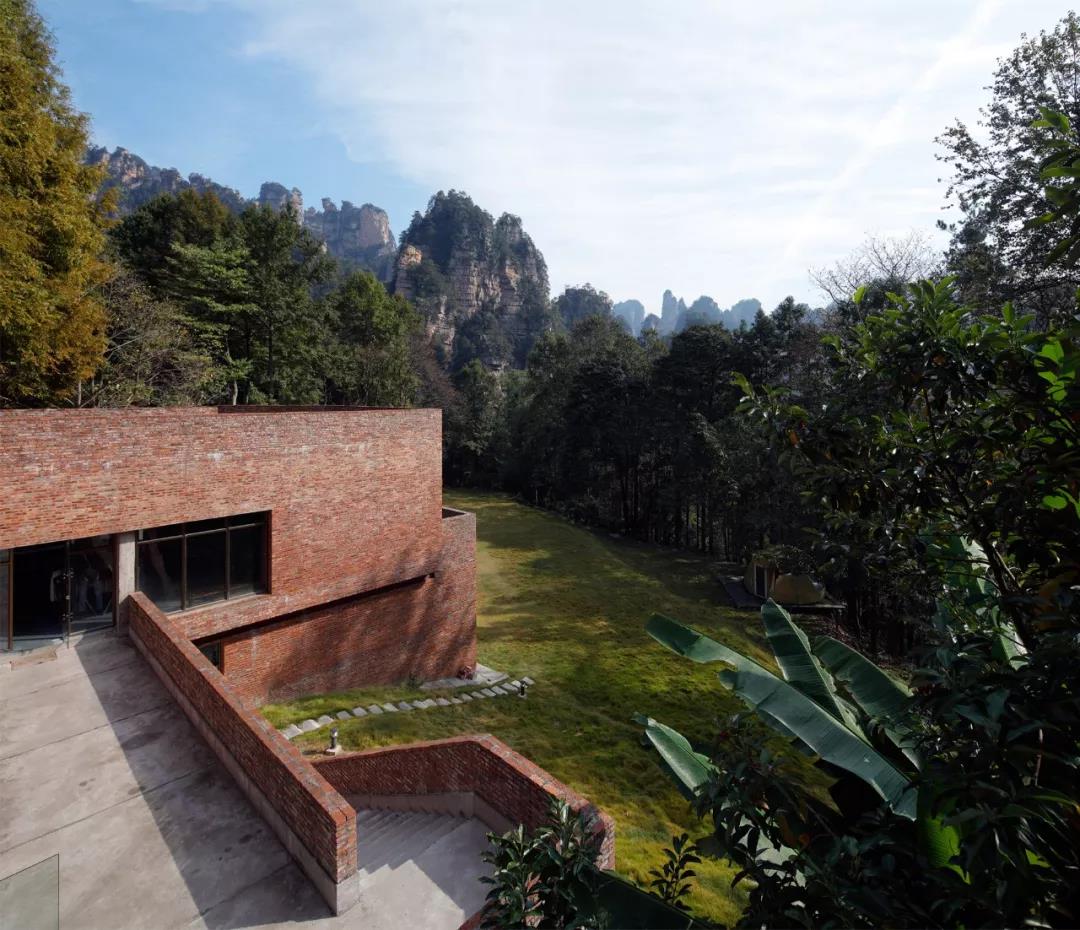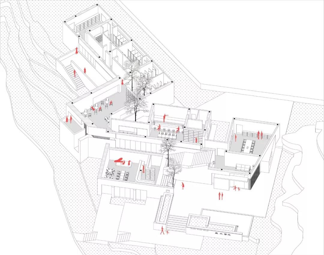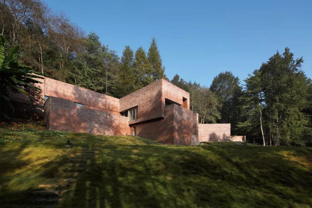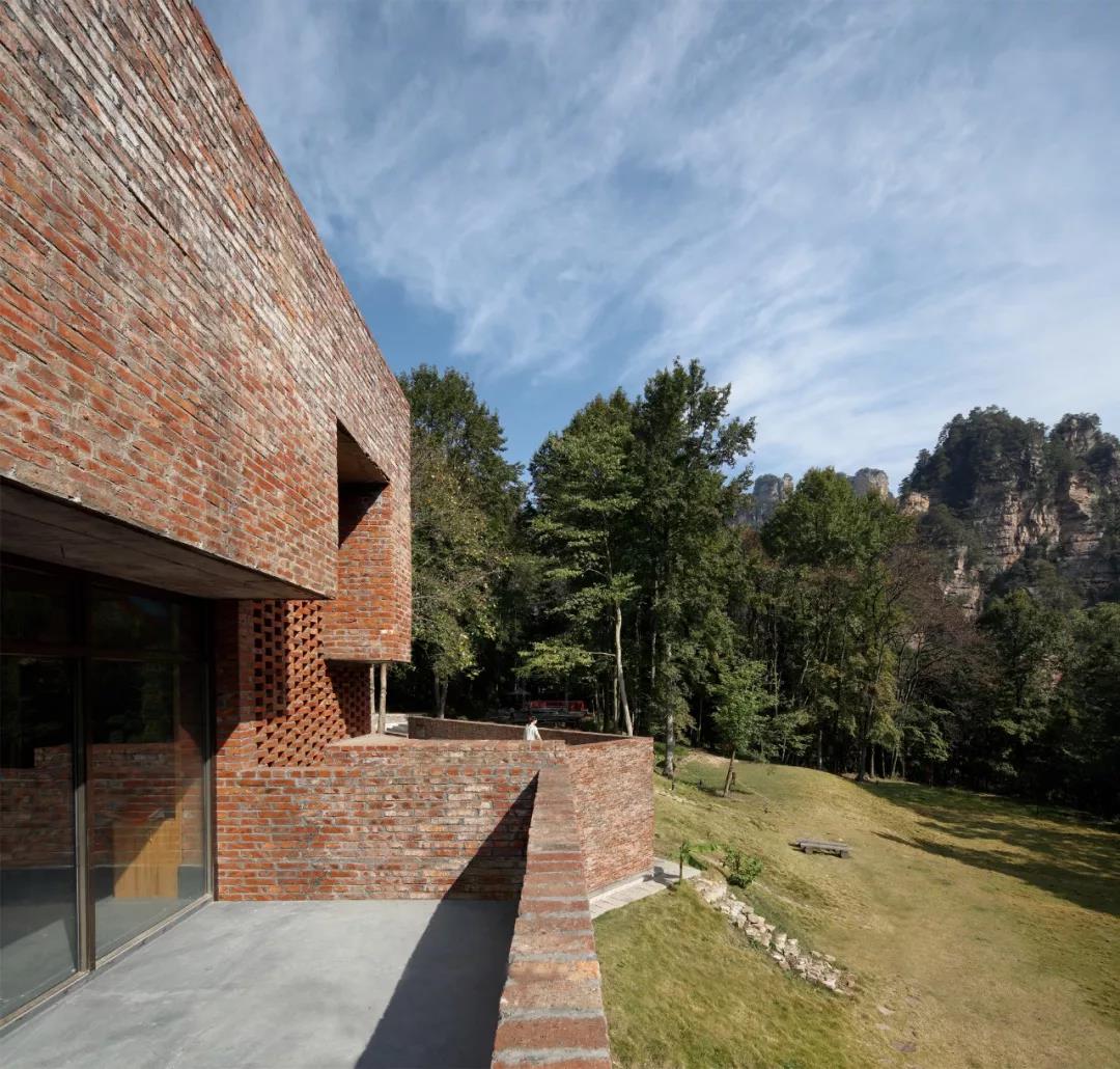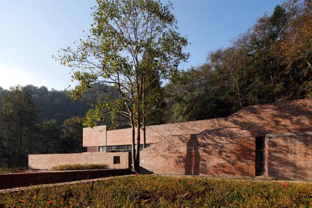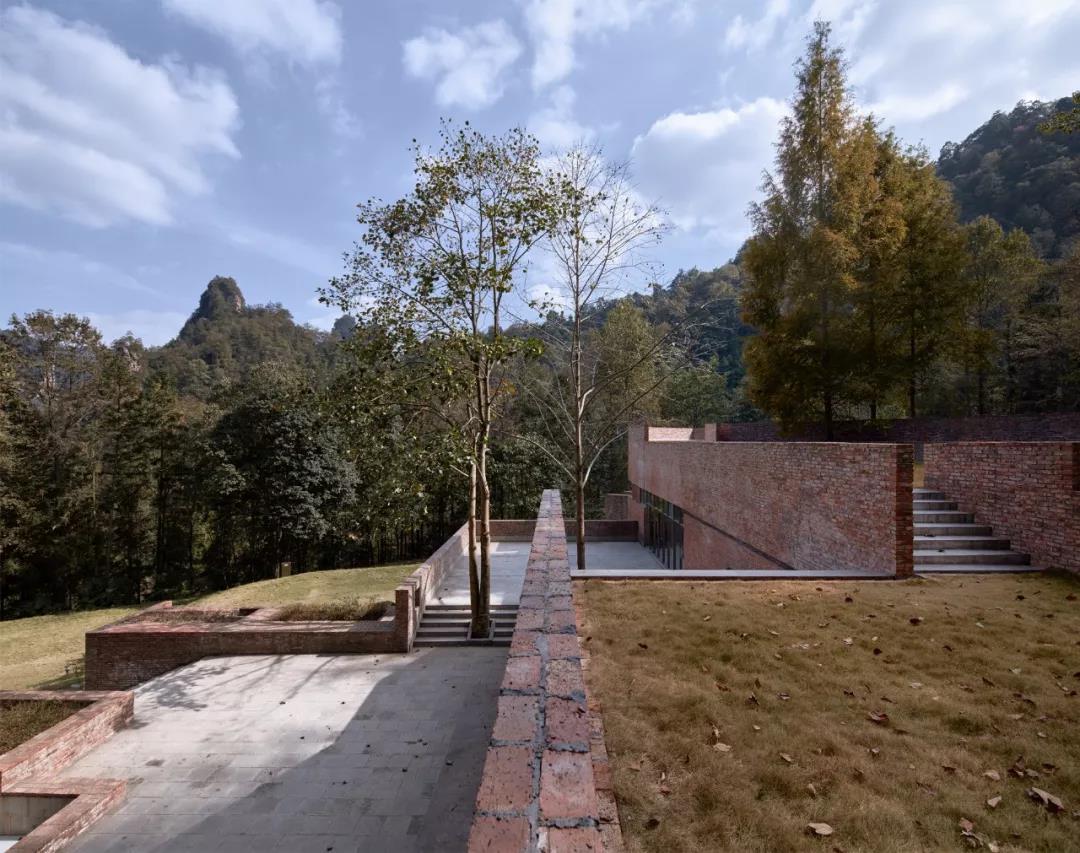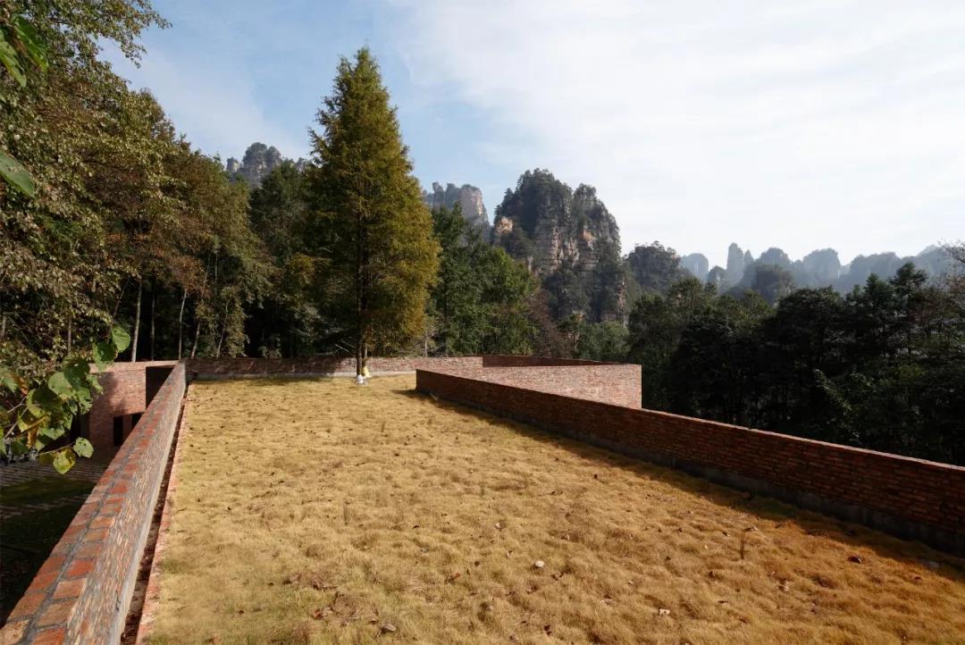 這樣,單一的風(fēng)景就變成了一系列的風(fēng)景切片,當(dāng)進(jìn)入到植草屋頂時(shí),草坪,較低標(biāo)高處的層層露臺(tái),延伸的紅磚墻體,保留的樹木就同遠(yuǎn)處的群山構(gòu)成了大地藝術(shù)般的畫面,建筑同風(fēng)景在一個(gè)更高的維度上融為一體。因此,“最具韻味的自然并非是毫無干預(yù)純粹天然的,而是被人工捕獲,并與人互動(dòng)互成的自然”。