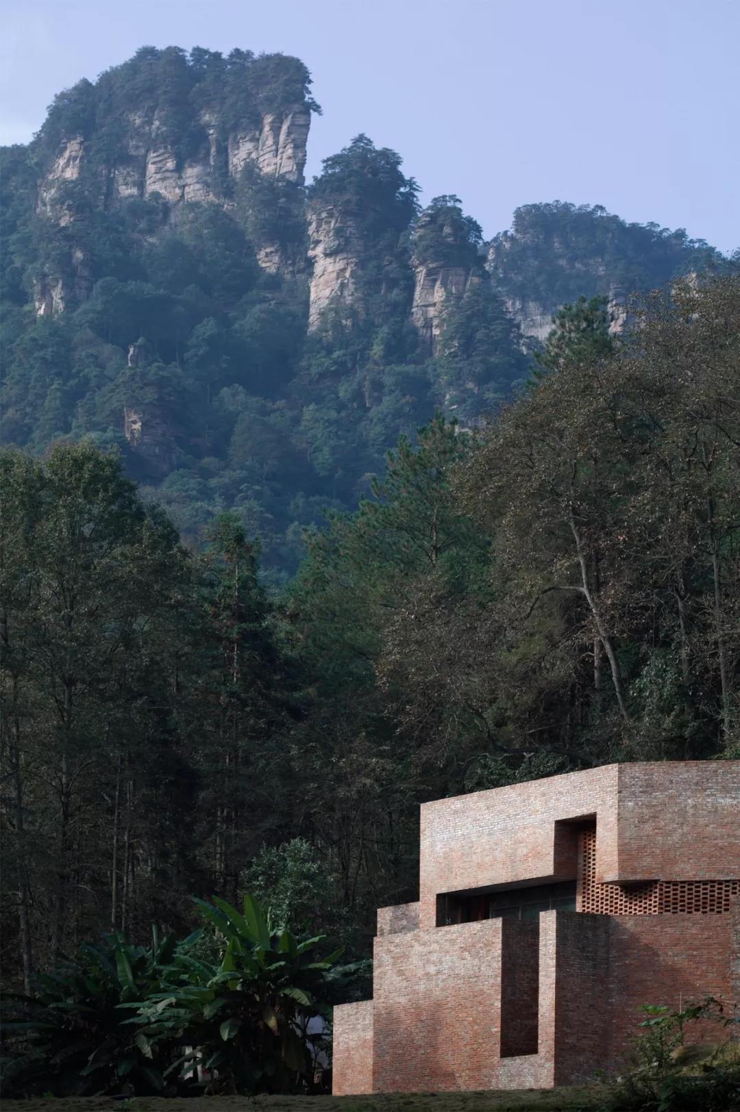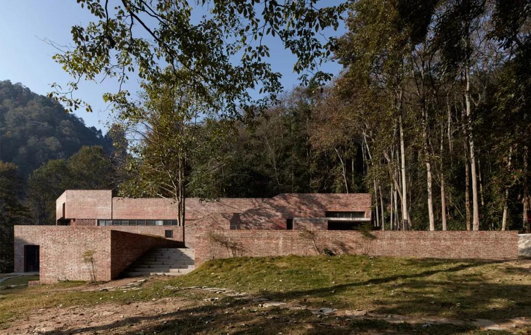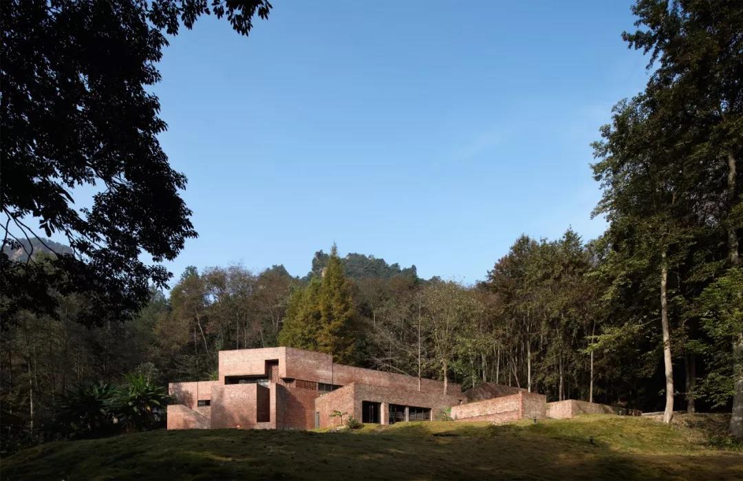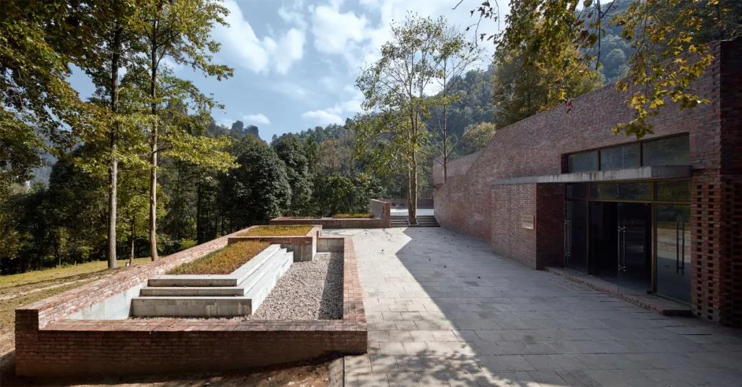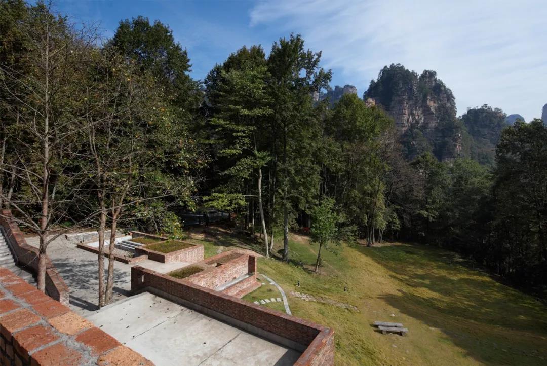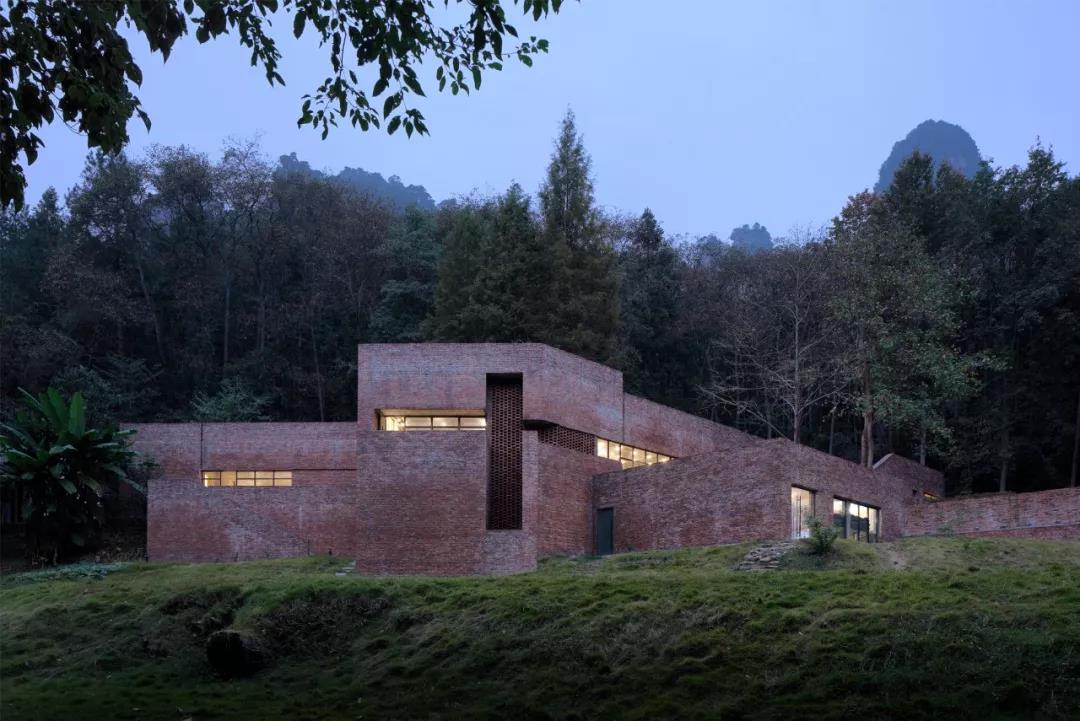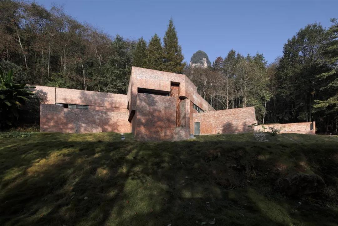 這樣,單一的風(fēng)景就變成了一系列的風(fēng)景切片,當(dāng)進(jìn)入到植草屋頂時(shí),草坪,較低標(biāo)高處的層層露臺(tái),延伸的紅磚墻體,保留的樹木就同遠(yuǎn)處的群山構(gòu)成了大地藝術(shù)般的畫面,建筑同風(fēng)景在一個(gè)更高的維度上融為一體。因此,“最具韻味的自然并非是毫無干預(yù)純粹天然的,而是被人工捕獲,并與人互動(dòng)互成的自然”。