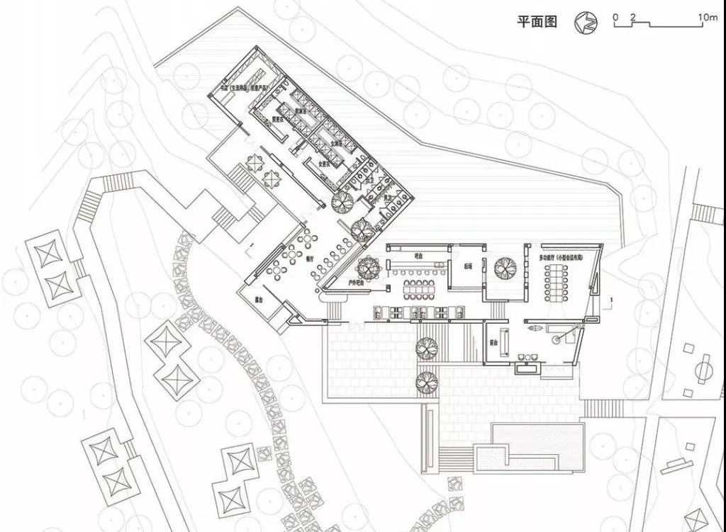 就是咖啡廳和茶室。這一空間的室外也對(duì)應(yīng)了一處大平臺(tái),并與入口廣場通過臺(tái)階相連。室外平臺(tái)可休憩,觀景和品茶,同時(shí)大平臺(tái)又是入口廣場向屋頂花園的過渡部分,這一過渡空間因?yàn)榈匦胃卟畹脑?,相互的連接轉(zhuǎn)換十分自然。