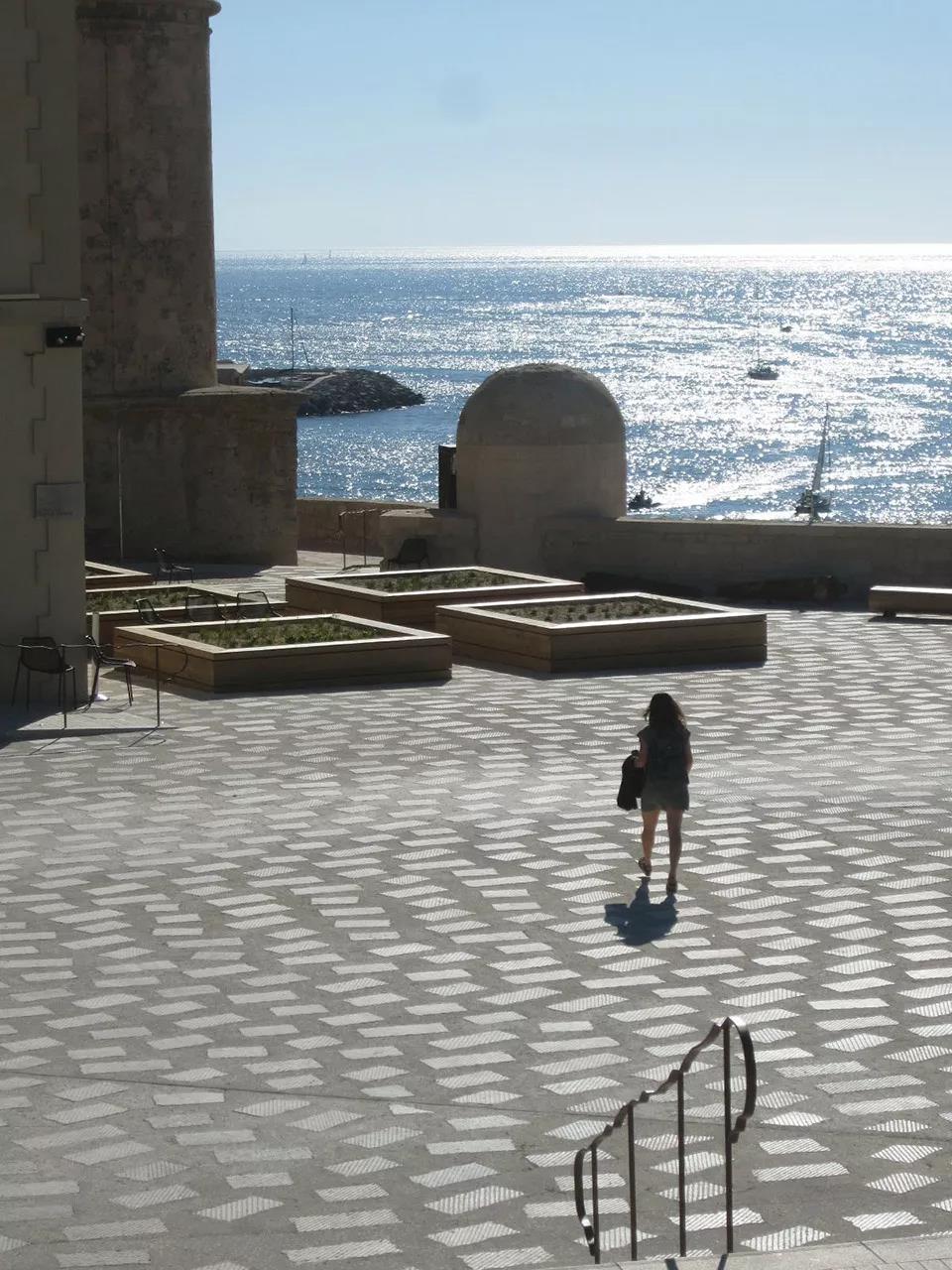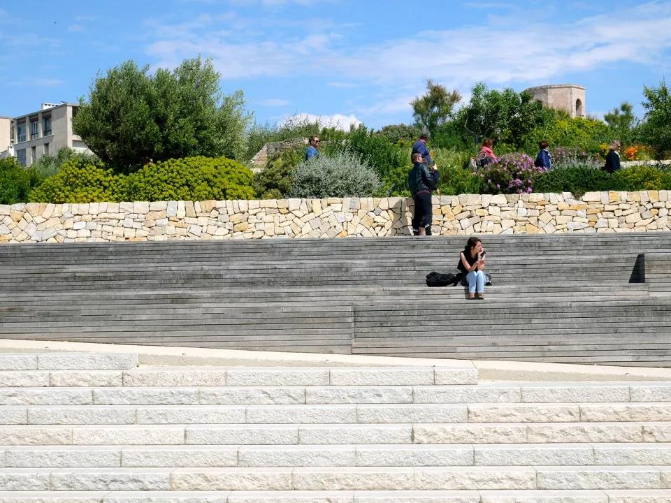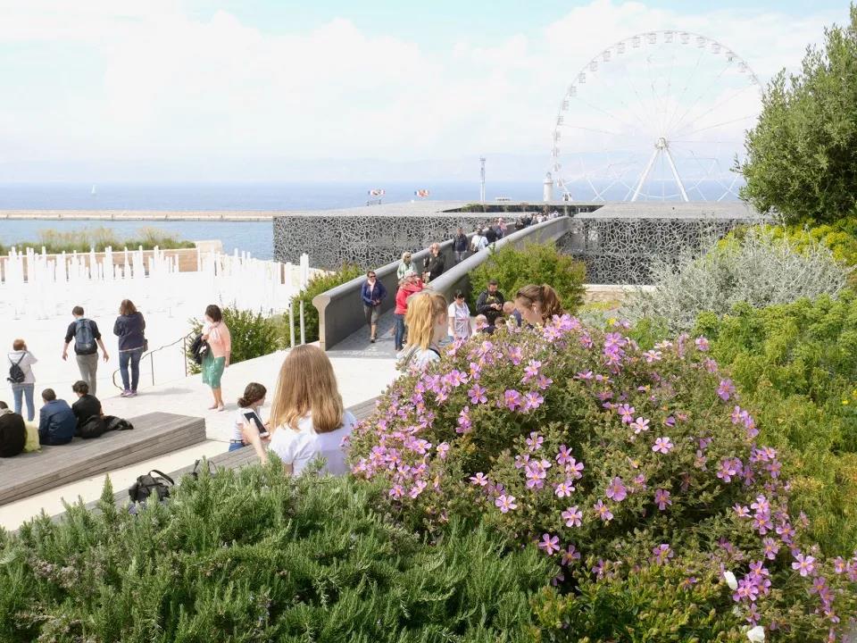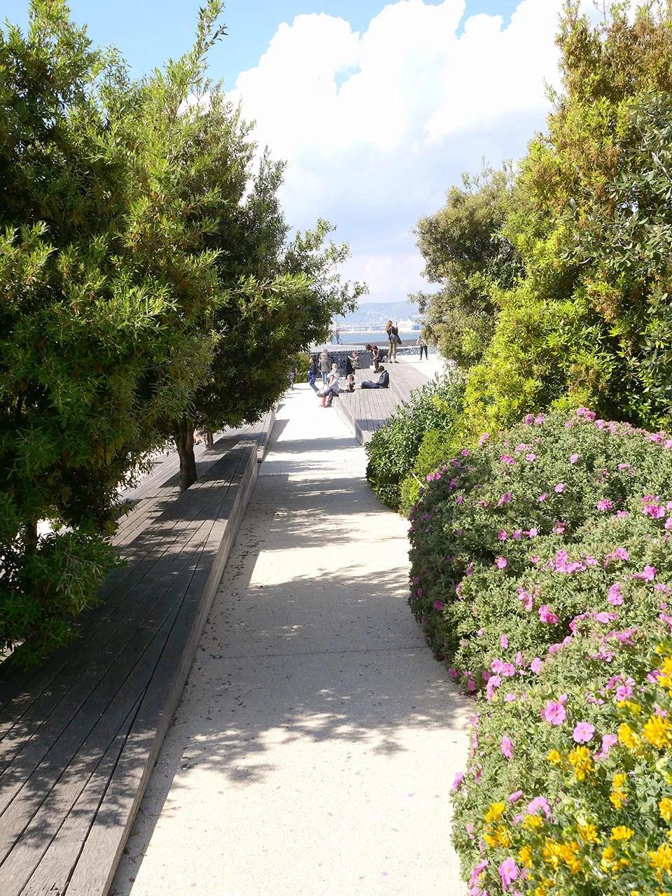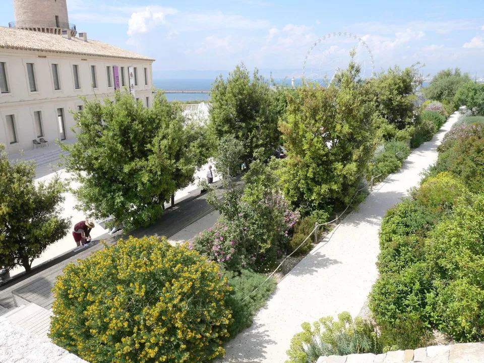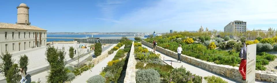 地中海民族植物學之旅空間將其花園空間延伸到了路堤的斜坡上。這個斜坡與d’Armes廣場西側人行步道的直線距離超過200米,享有馬賽市及其地標性建筑(如大教堂主樓和圣羅蘭教堂等)的絕佳景觀視野?;▓@中種植著一系列穆斯林和猶太基督教文化中常見的傳統植被,這些植被如同壁畫一樣,為游客們提供了一個近距離接觸和體會地中海民族文化的機會。
