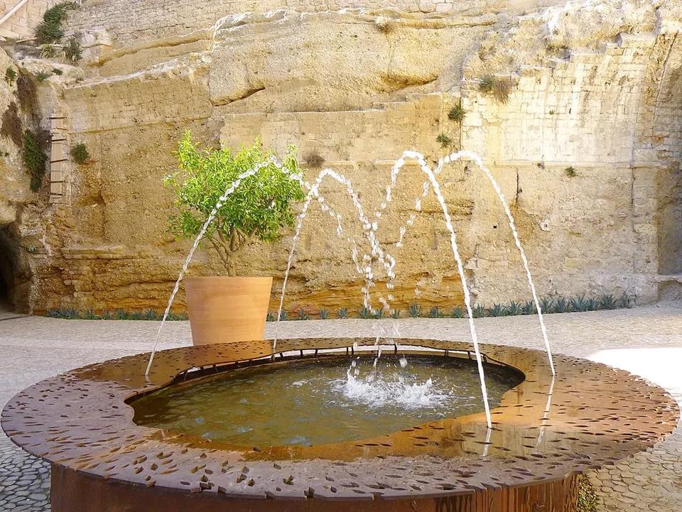 默特爾庭院位于光影畫廊的出口附近,地理位置絕佳,游客們可以在此俯瞰種植著橘子樹的入口庭院。庭院面積不大,設計團隊在里面種上了桃金娘科植物。這一設計其實非常巧妙,因為當人們在心中默念著桃金娘這個名字的時候,腦海中就會不禁地浮現出格拉納達(Granada)的阿爾罕布拉宮(Alhambra)。花園的一側鋪設著石灰石路面,一個小型的樓梯直接將西墻邊的步道與通向載人電梯的小路連接了起來,以便于行動不便的游客去往下層空間的指揮官畫廊?;▓@的另一側整齊地排列著繁茂的桃金娘科植物和石榴樹,在視覺上強調了花園絕佳的地理位置:它就像是一個陽臺,不僅靜靜地懸浮在庭院、廣場高塔、背景中的教堂和Ailantes花園的上空,更提供了城市和港口的局部景觀。