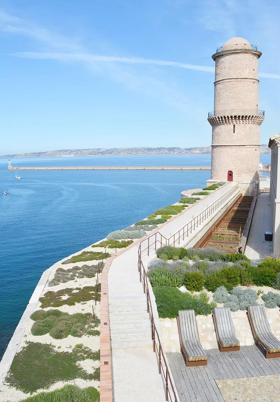 以老港口為起點,穿過King René塔(tower of King René)旁的大門,人們便進入了Fort Saint Jean防御工事景區;再穿過一道厚厚的墻體,一個隱藏在石質高墻下的封閉世界猝不及防地撞入游客的眼簾。在藍天下,這個建在小島上的景區邀請著人們入內一探究竟。