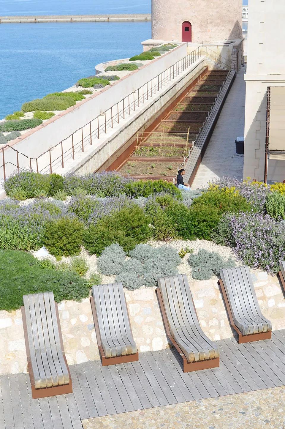 在咖啡館露臺和Georges Henri Rivière大樓的后方設置著一個地中海式的菜園。這個方形的菜園沿著防御工事景區的西墻布置,向北一直延伸到信標塔附近。菜園內種植著各種當地或外來的蔬菜,這些蔬菜按照顏色的順序排列,無論是在冬季還是在夏季,都在向人們展示著地中海特有的植物文化。